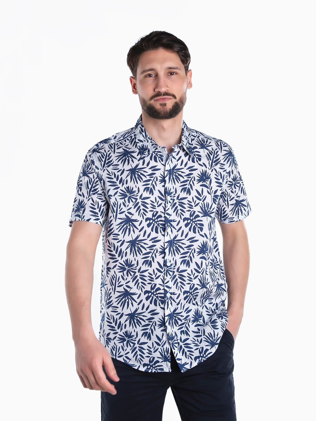 Camisa branca com folhas azuis para homem. Camisa de manga curta com gola de abas. Aperto frontal de botões.