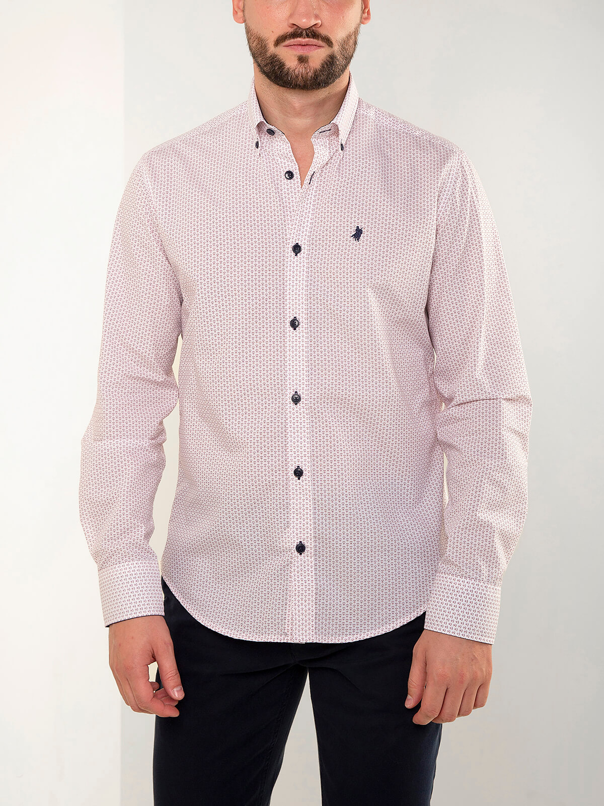 Camisa clássica branca com padrão bordeaux, corte confortável, colarinho americano e botões contrastantes. Modelo versátil para looks mais arrumados do dia a dia ou ocasiões especiais.