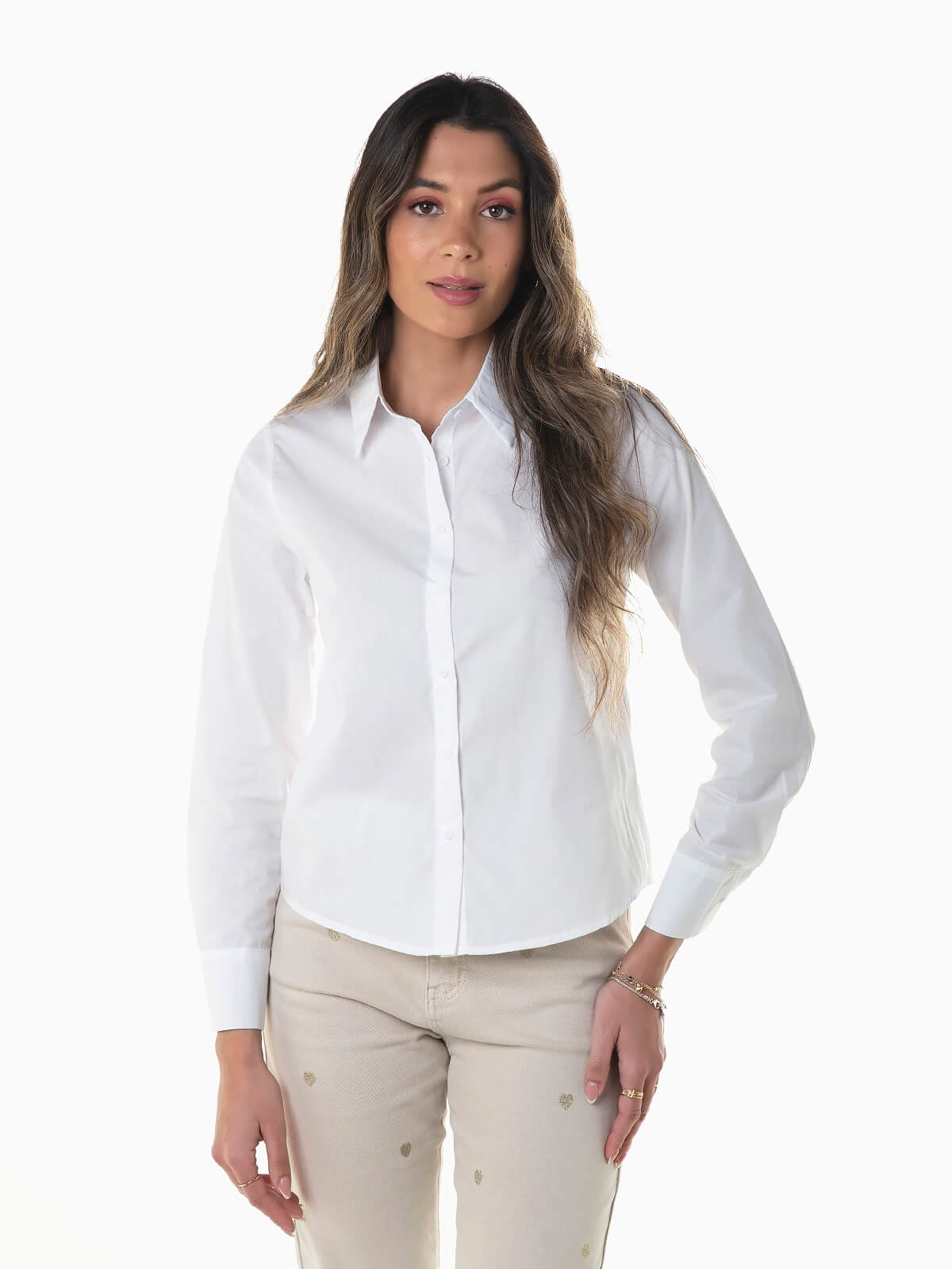 Camisa branca com manga comprida para senhora. Camisa com gola de abas e punhos abotoados. Aperto de botões.