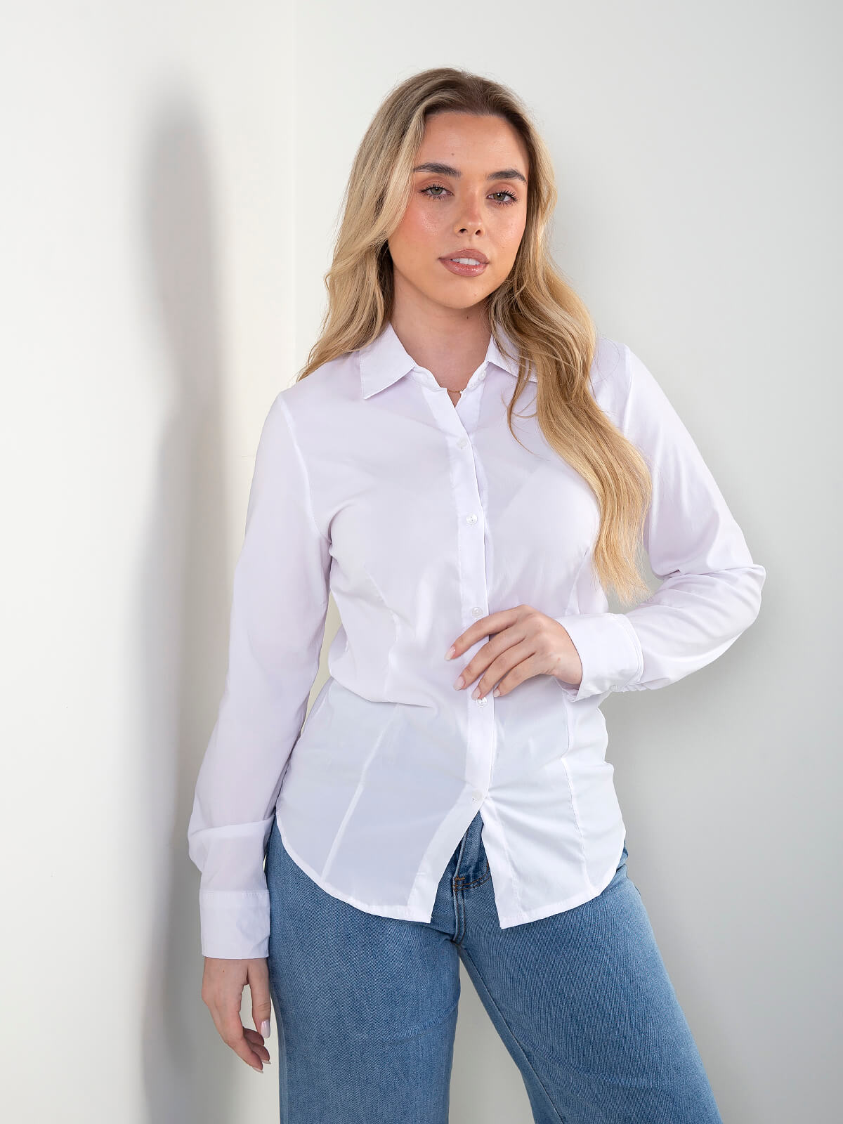 Camisa branca elástica de corte clássico, com colarinho e botões frontais. Um essencial intemporal para looks formais ou de dia a dia, fácil de conjugar em qualquer estação.