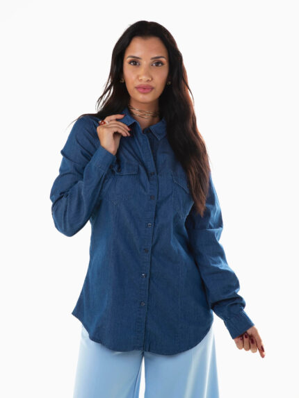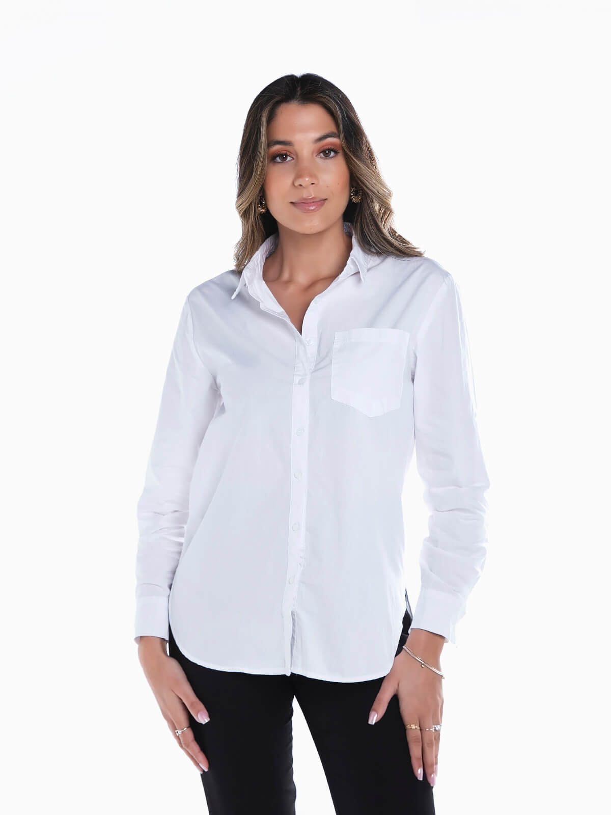 Camisa branca de manga comprida com presilhas para senhora. Camisa em tecido 100% algodão com aberturas laterais na base. Gola de abas. Bolso no peito. Aperto frontal de botões.