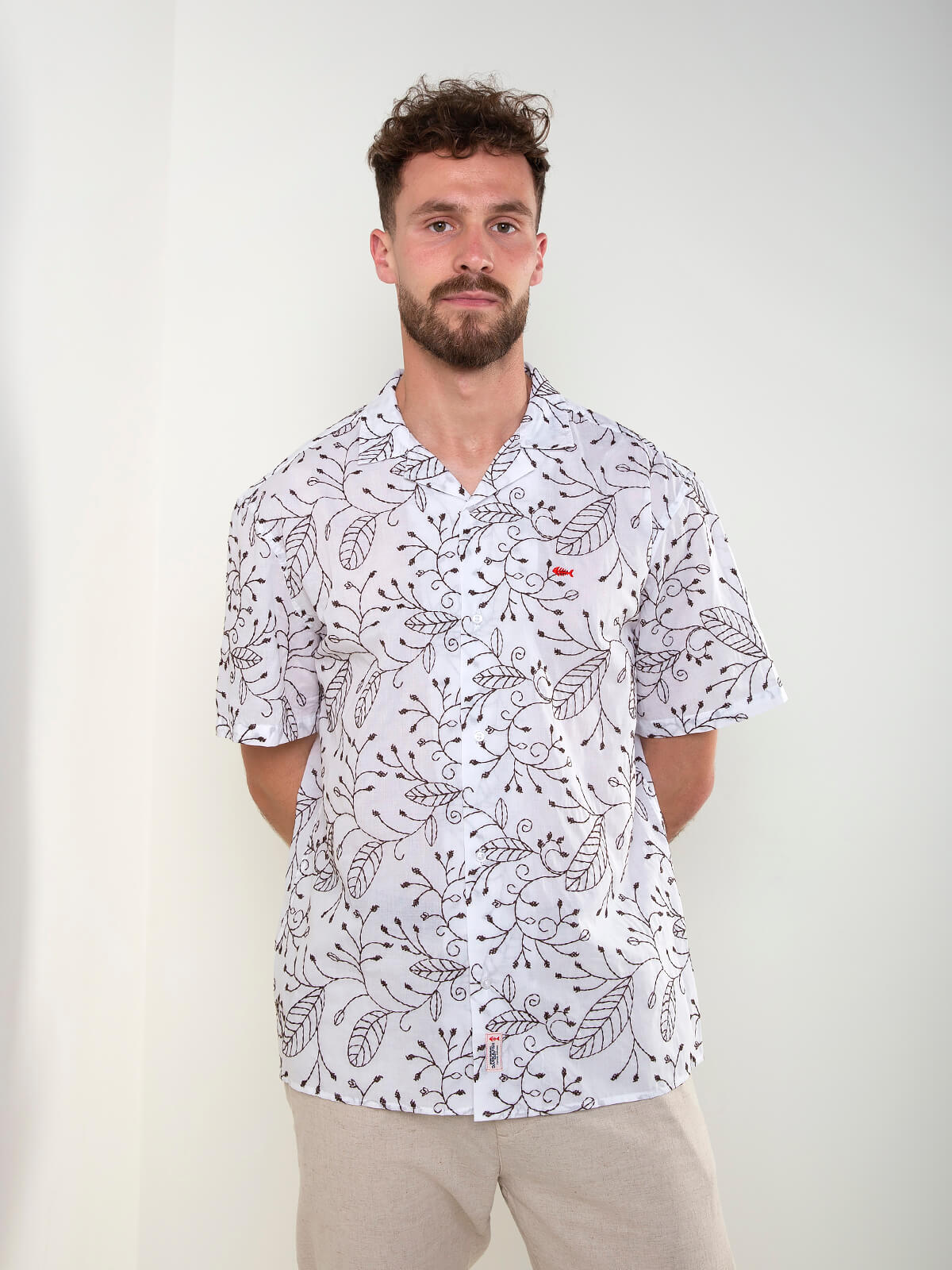 Camisa de manga curta em tom branco com bordado floral. Modelo com fecho frontal por botões e colarinho bowling, que confere um visual descontraído. Leve e confortável, ideal para looks casuais de verão com um toque diferenciador.