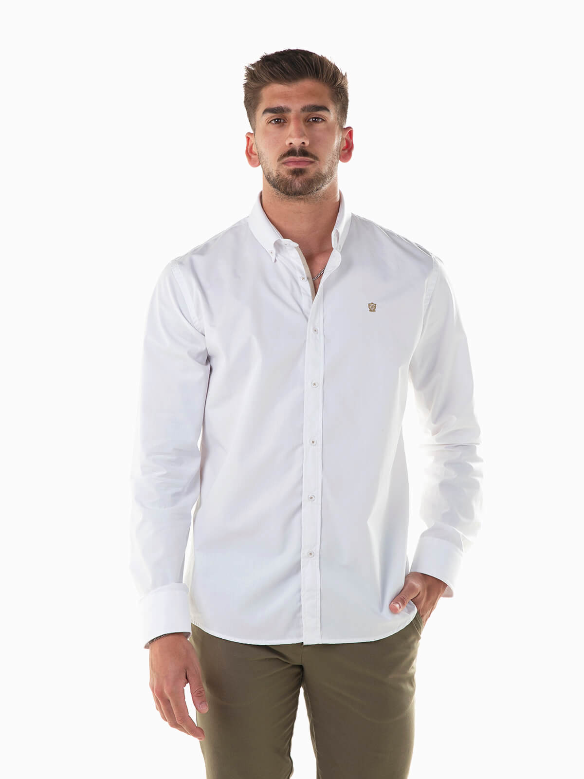 Camisa branca slim fit 100% algodão para homem. Camisa de manga comprida com símbolo bordado no peito em contraste. Colarinho americano e punhos abotoados. Aperto frontal de botões.