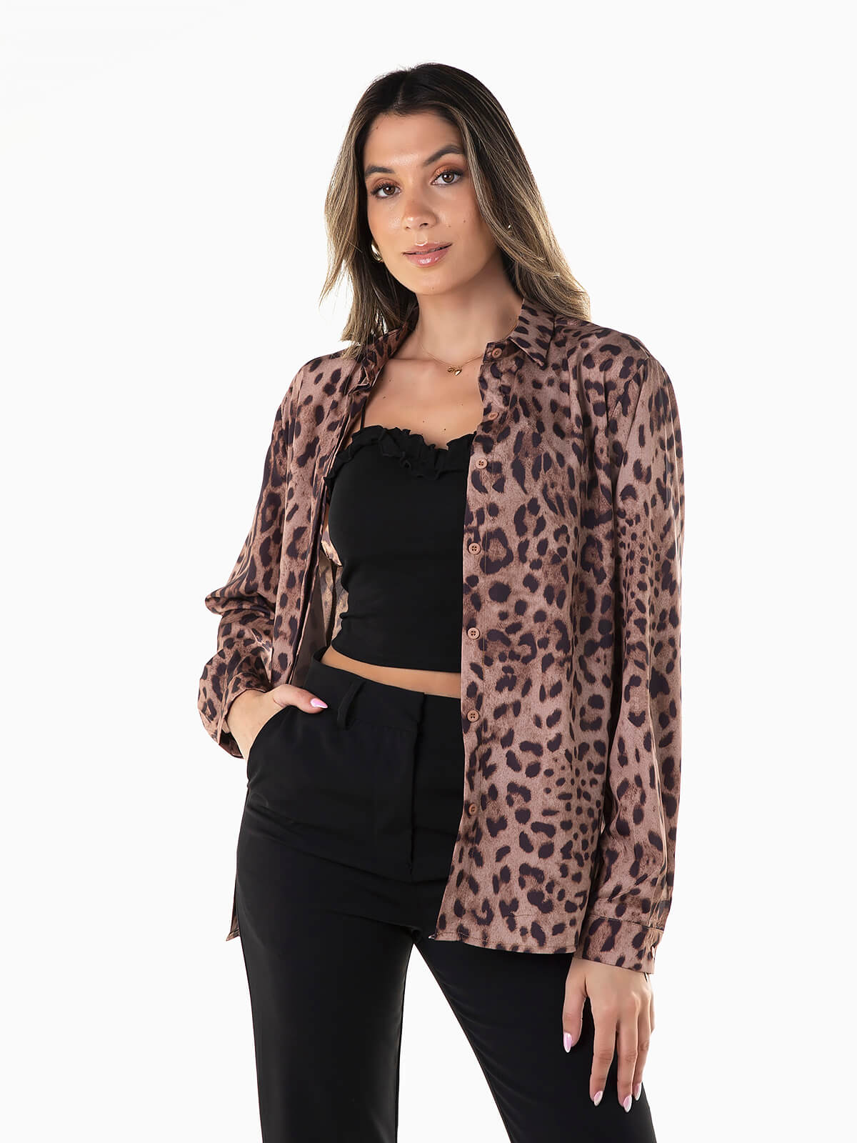 Camisa camel animal print com manga comprida e punhos abotoados. Camisa para senhora com gola abas. Aperto de botões.