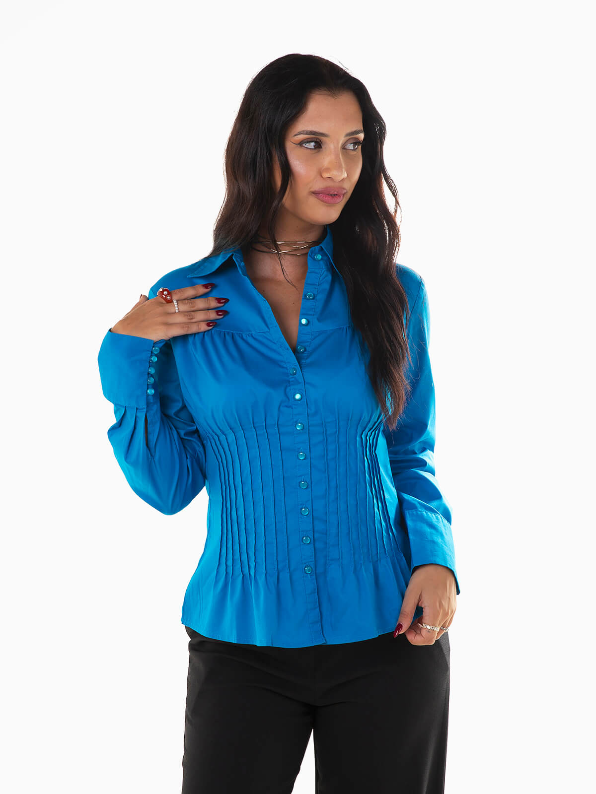 Camisa de manga comprida para senhora com costuras reforçadas para efeito cintado. Camisa para mulher com gola de abas e punhos abotoados. Aperto de botões.