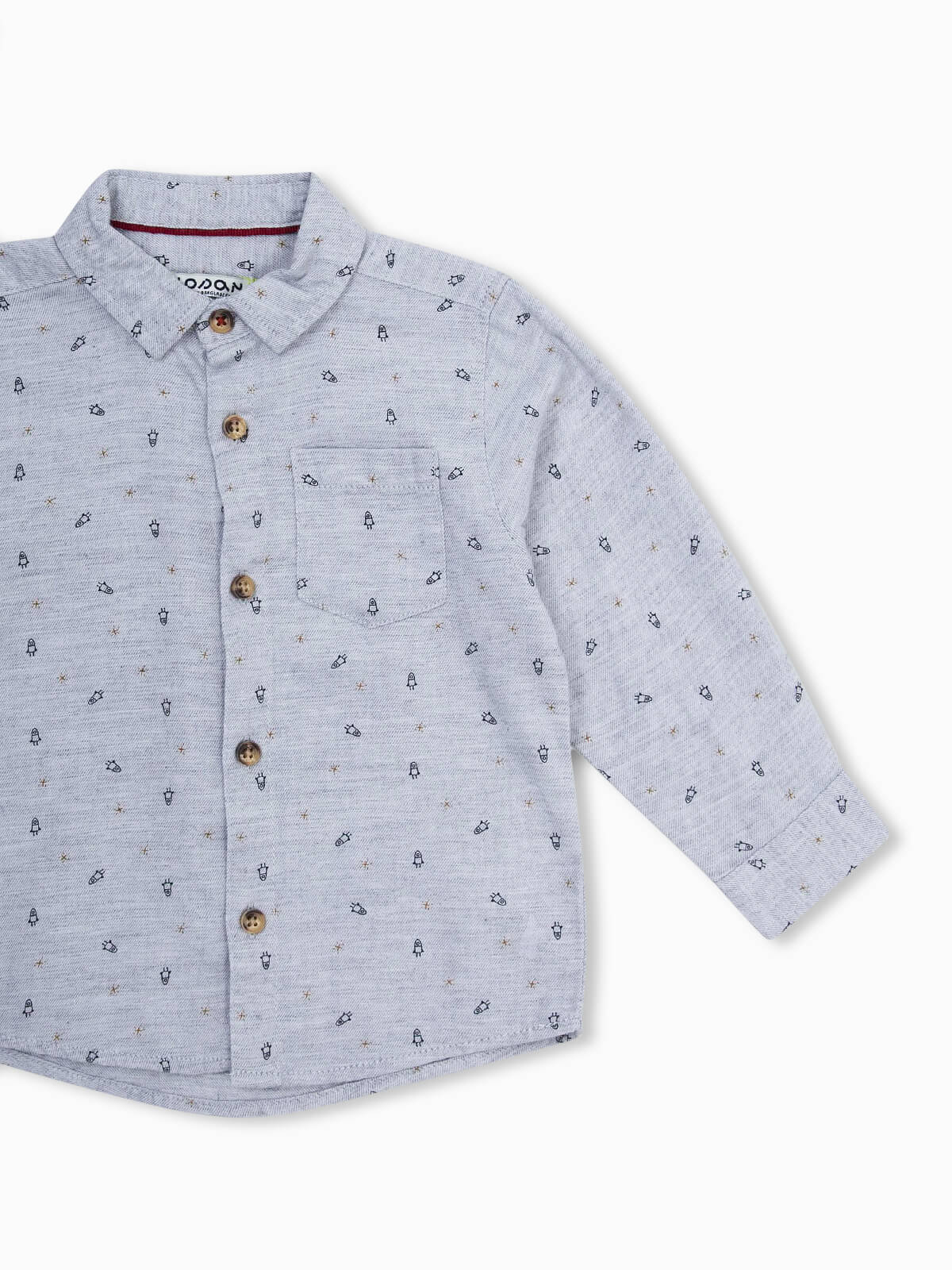 Camisa cinza com estampado de foguetões para bebé menino. Camisa em tecido 100% algodão para maior conforto. Manga comprida e punhos abotoados. Gola de abas e bolso no peito. Aperto de botões.