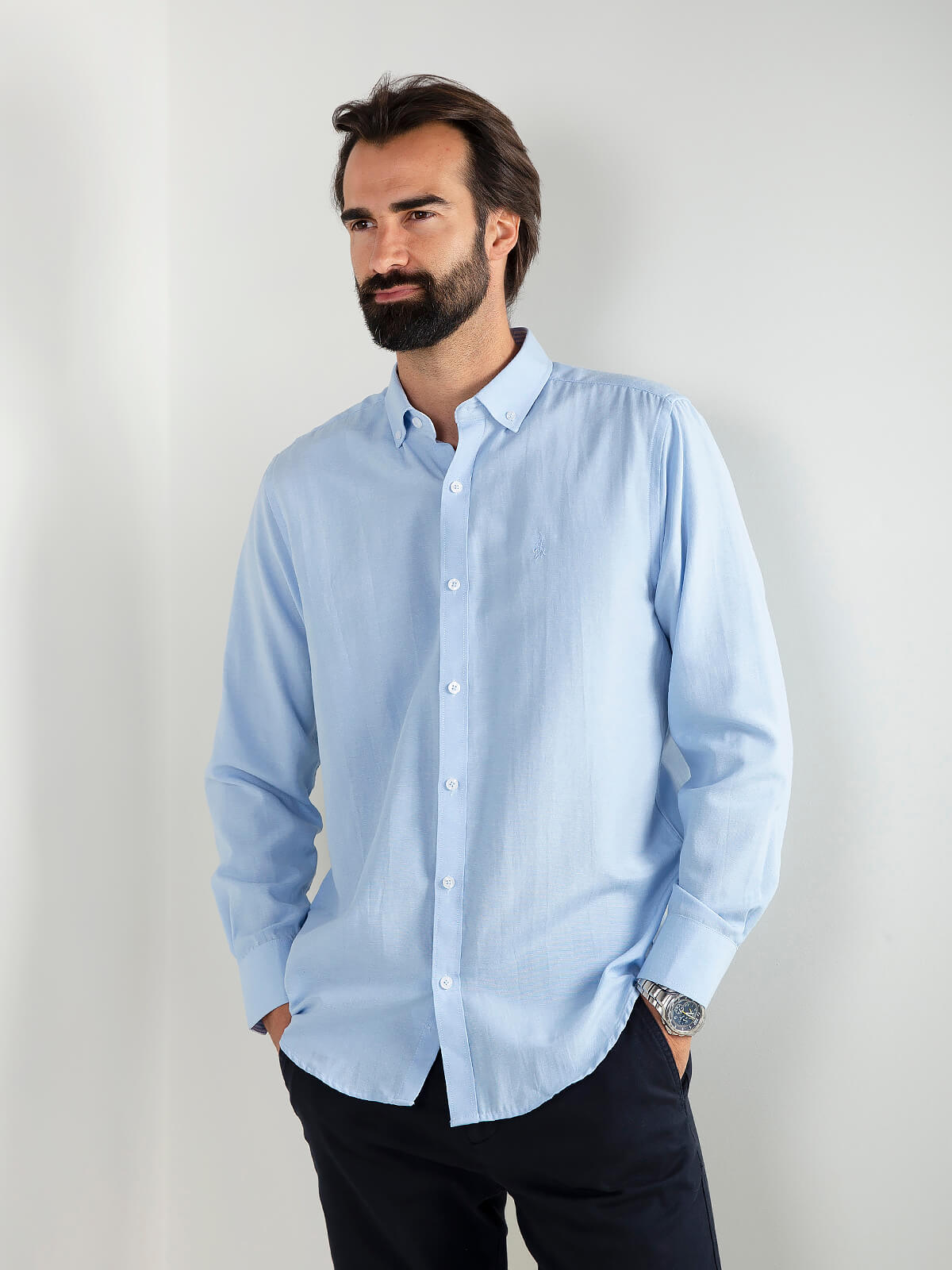 Camisa clássica azul bebé para homem, colarinho americano, punhos abotoados e símbolo bordado. Modelo leve e versátil.