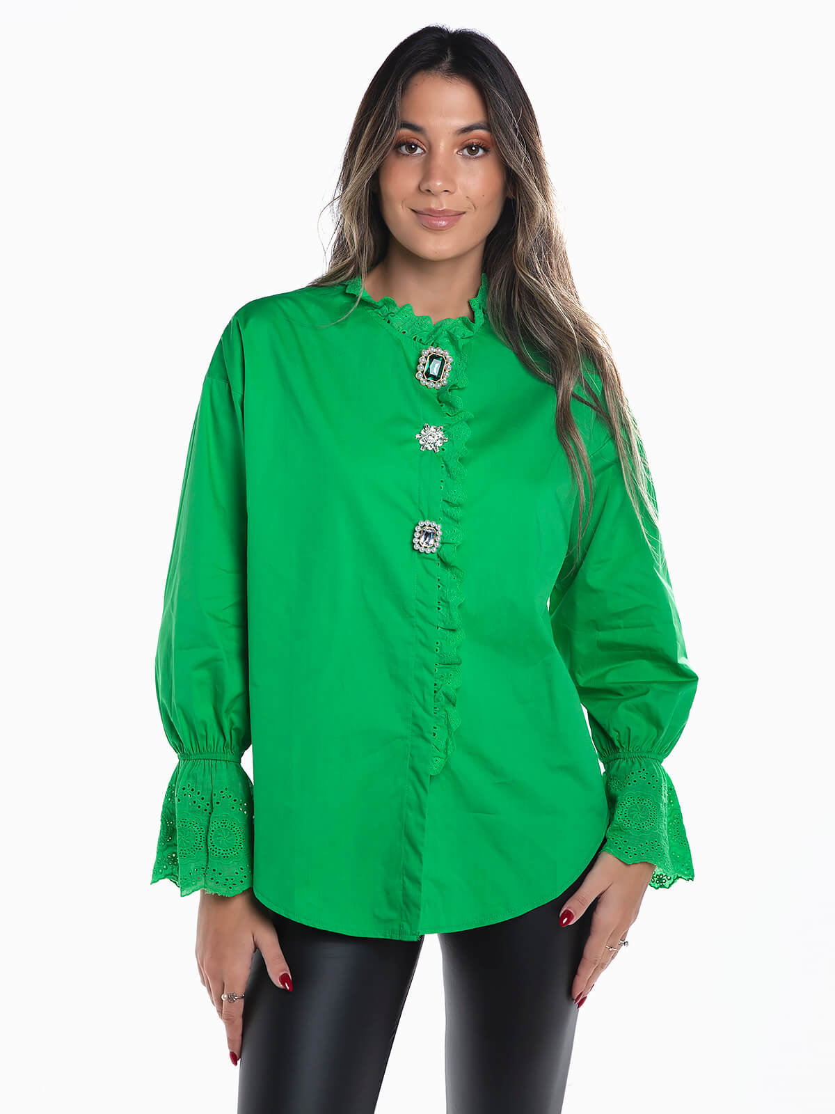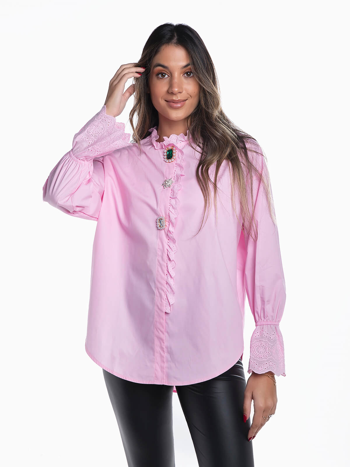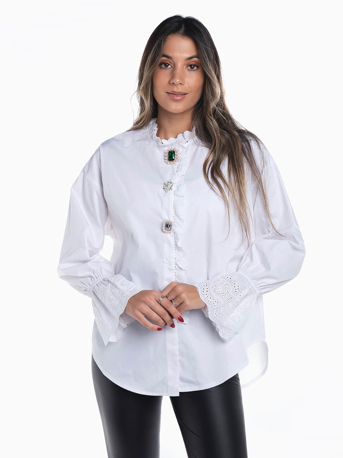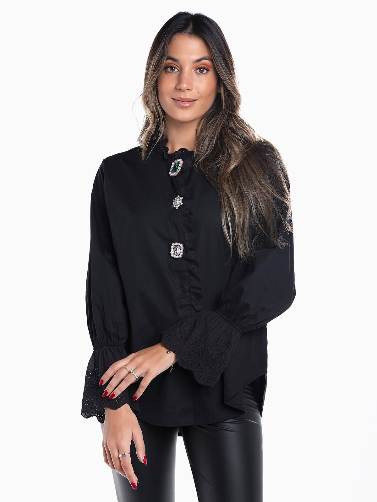 Camisa com aplicação de jóias e pérolas. Camisa popelina combinada com tecido bordado inglês nas extremidades. Manga comprida. Punho com elástico. Aperto de botões pressão.