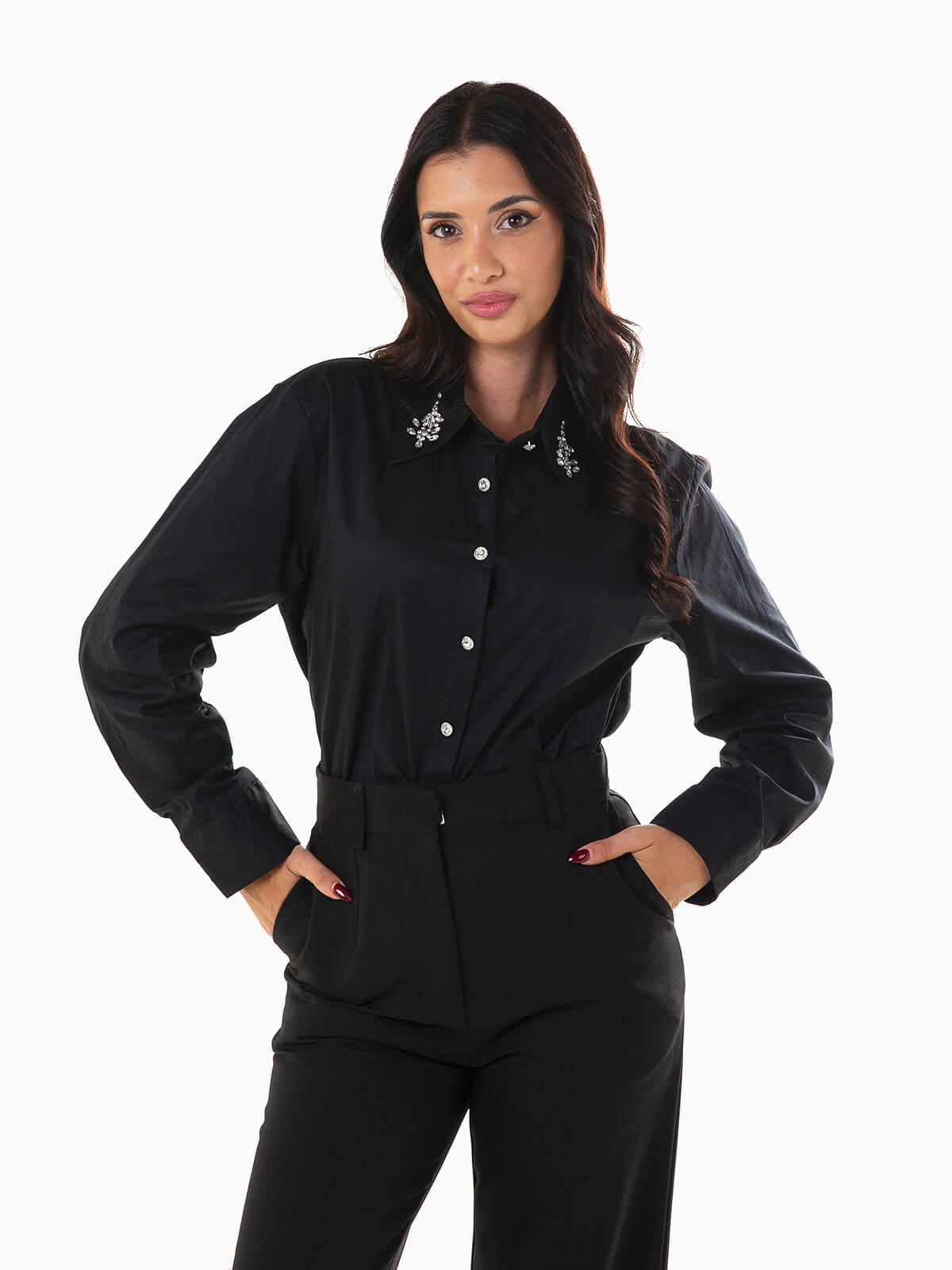 Camisa 100% algodão com aplicações brilhantes no colarinho. Camisa de manga comprida com punhos abotoados e gola de abas. Aperto frontal de botões de jóia.