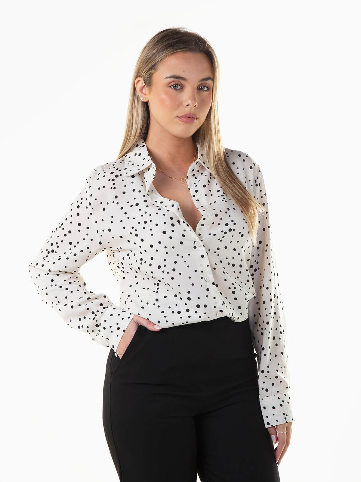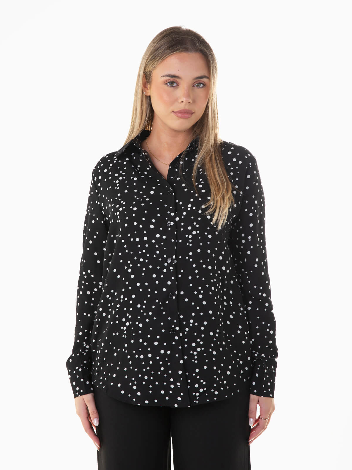 Camisa para mulher com bolinhas estampadas em contraste. Camisa de manga comprida com punhos abotoados e gola abas. Aperto frontal de botões. Cós arredondado mais comprido atrás.