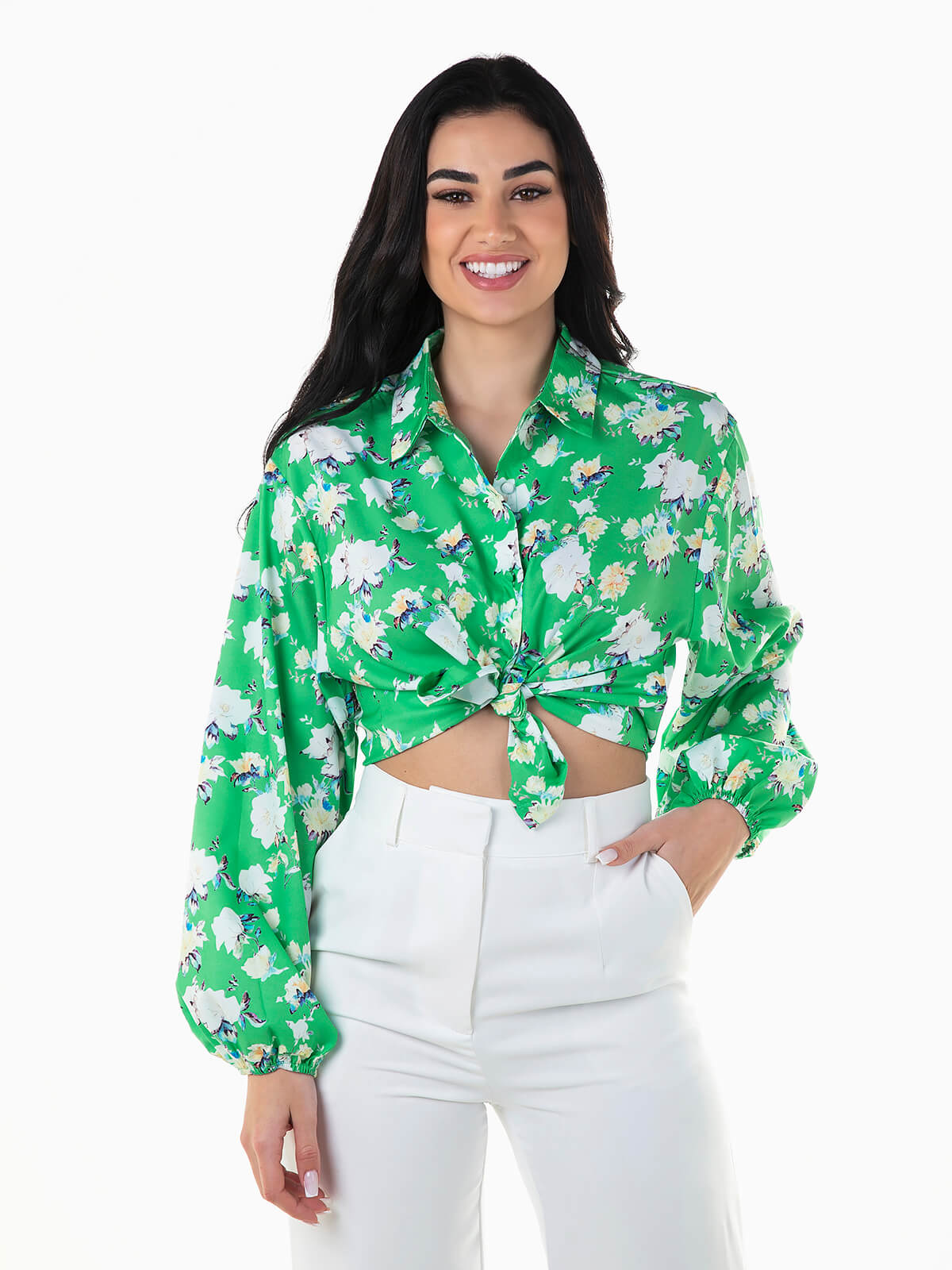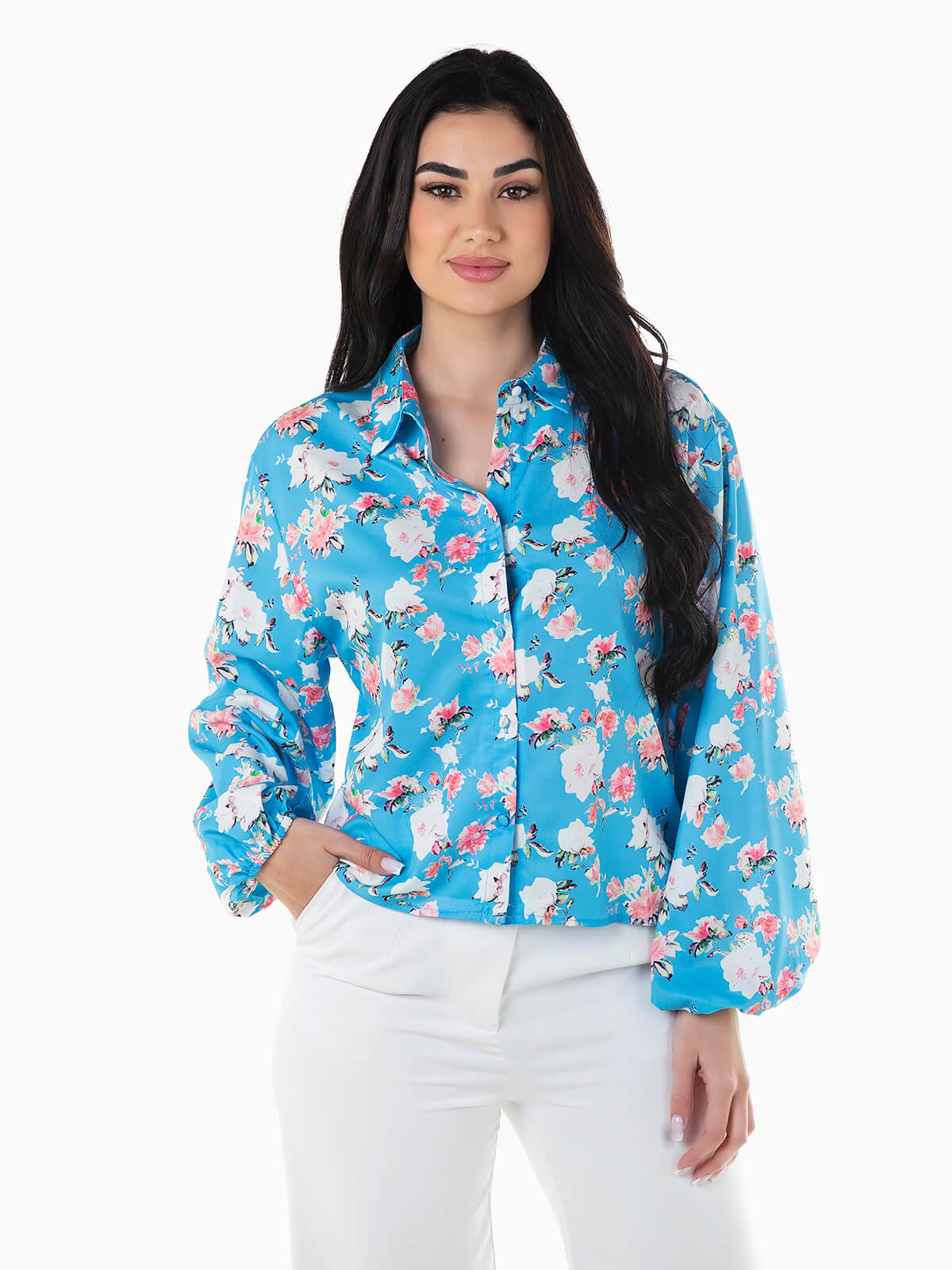 Camisa fluída com estampado floral para senhora. Camisa de manga comprida abalonada com punho elástico. Gola abas. Aperto frontal de botões forrados no mesmo tecido.