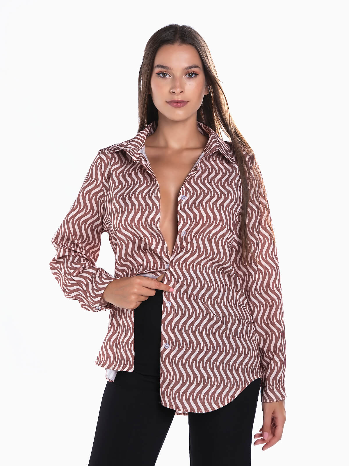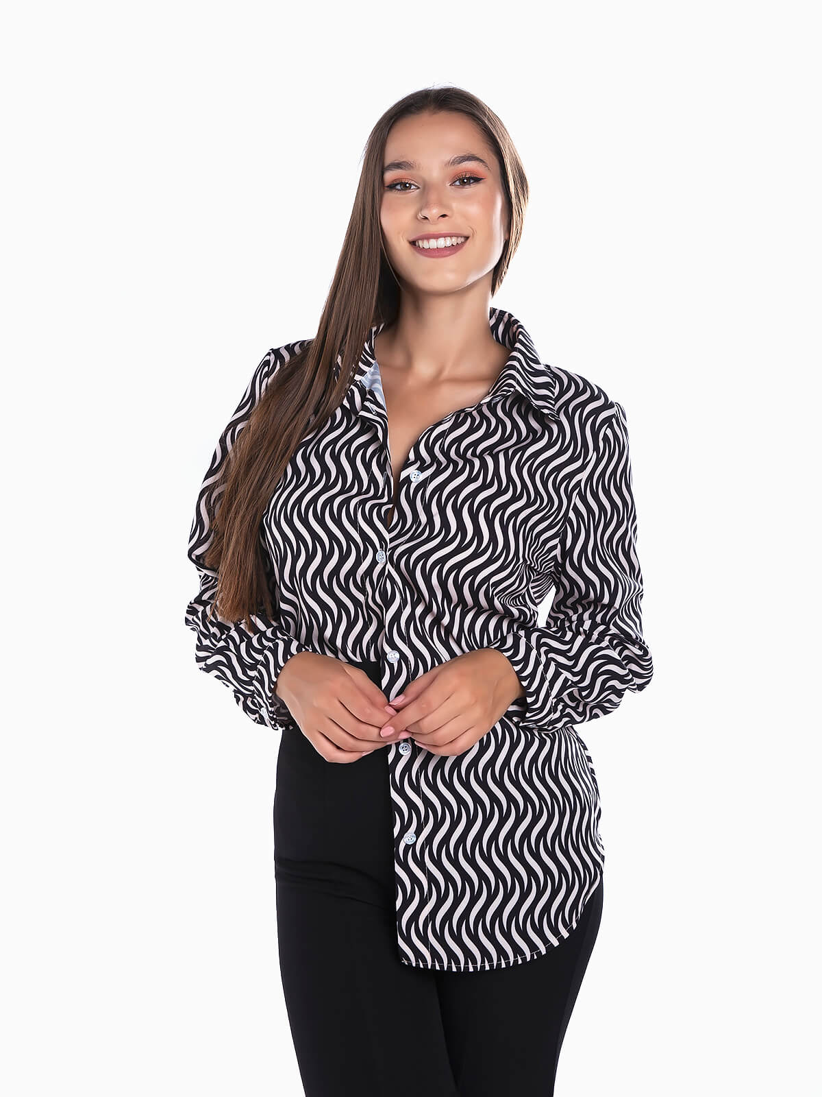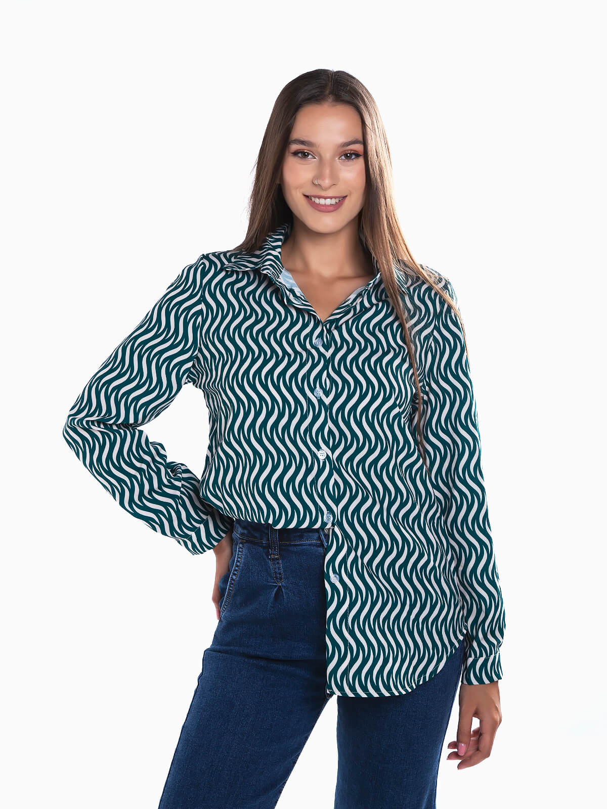 Camisa com estampado geométrico para senhora. Camisa com cós arredondado. Gola de abas. Manga comprida. Punhos abotoados. Aperto frontal com botões.
