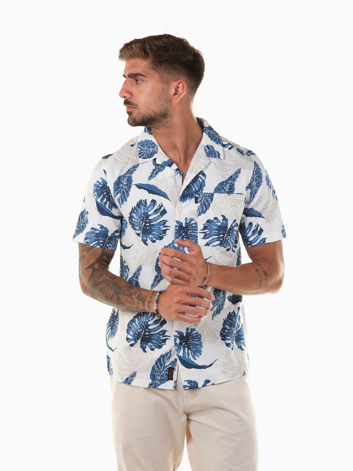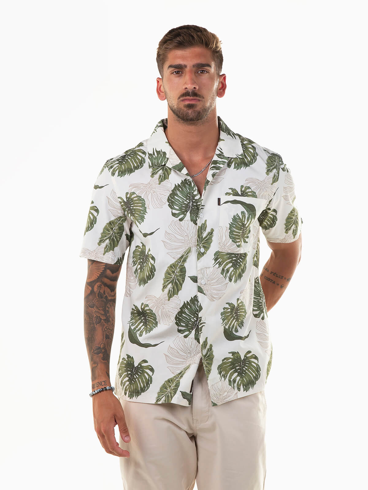 Camisa de manga curta 100% algodão para homem. Camisa de verão com estampado tropical e gola abas. Bolso no peito. Aperto frontal de botões.