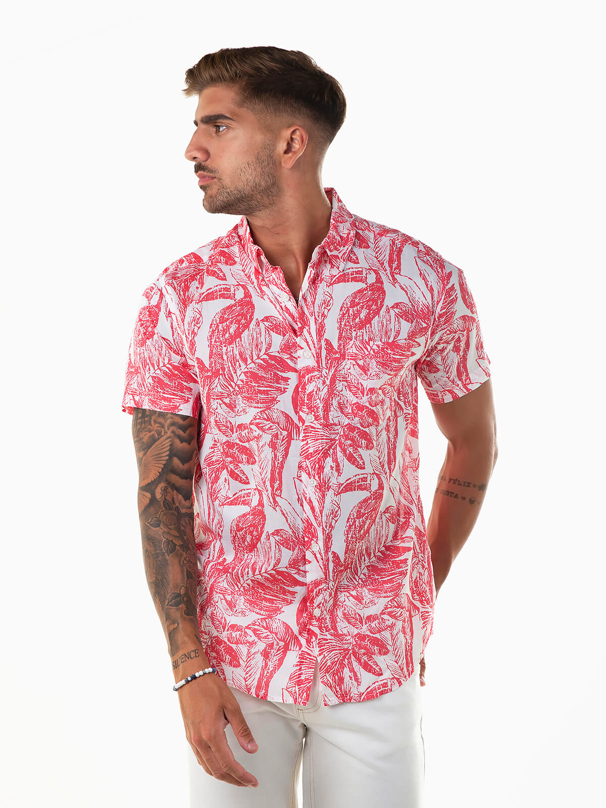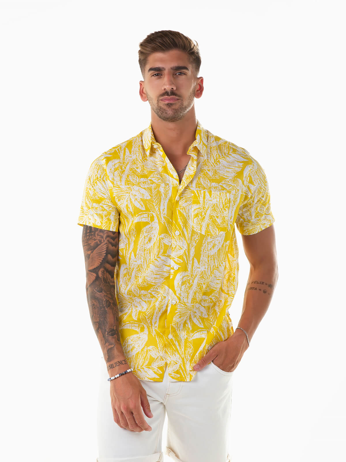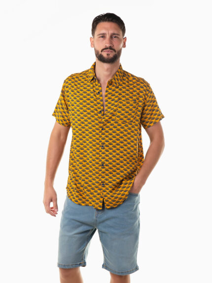 Camisa de manga curta com estampado folhas. Camisa de verão para homem com bolso no peito e colarinho abas. Aperto frontal de botões.