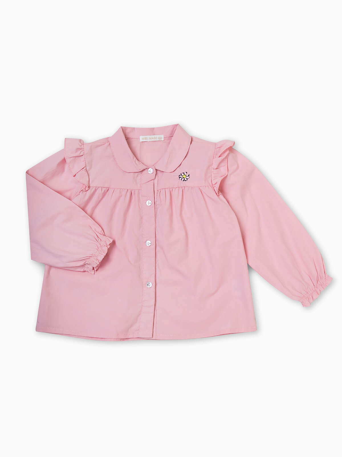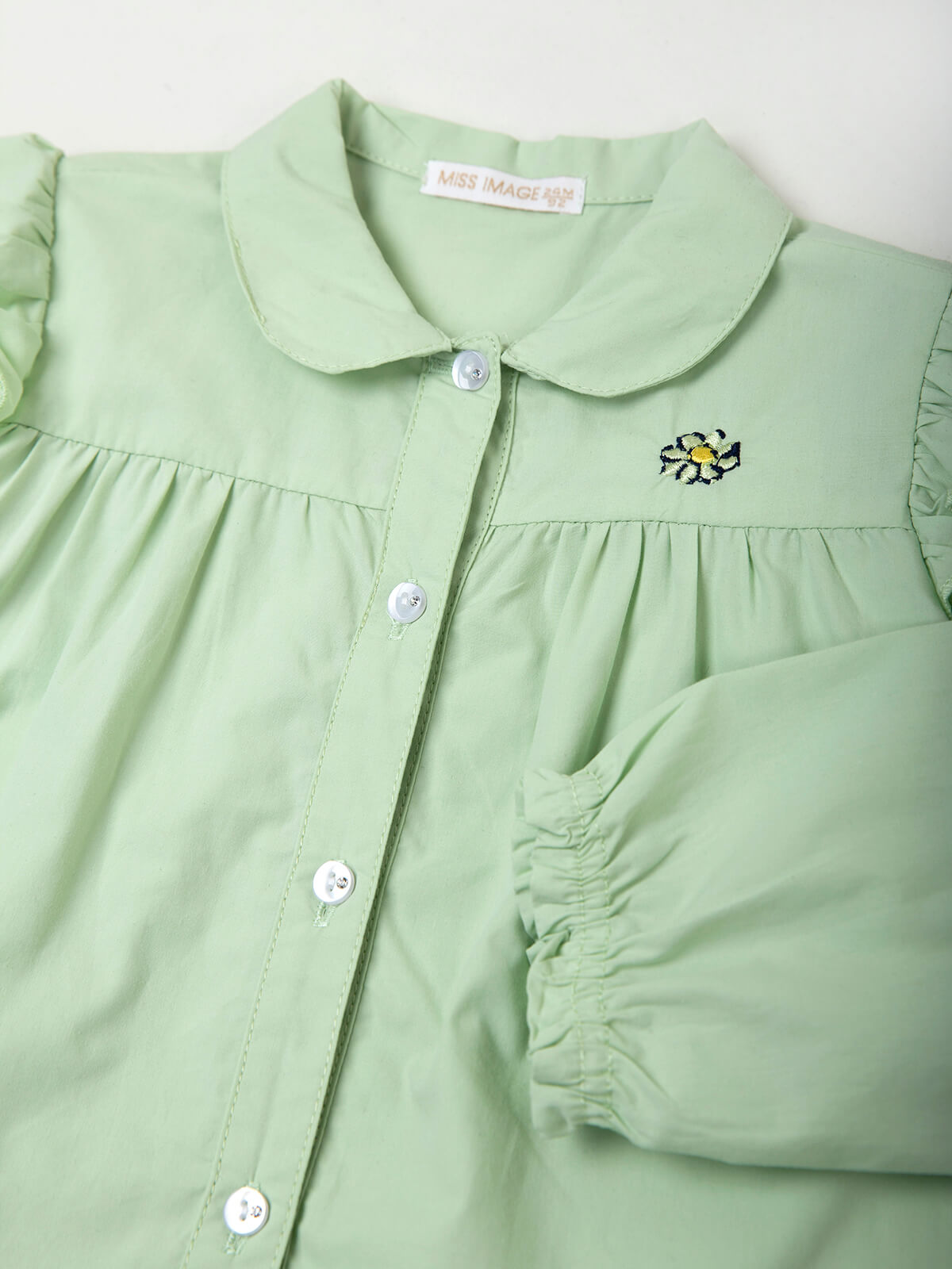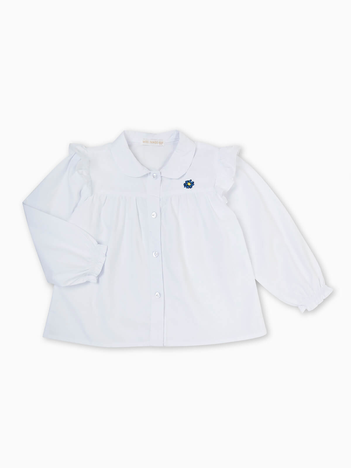 Camisa com folhos aplicados e bordado de flor no peito. Camisa popelina com manga comprida e elástico no punho. Gola abas. Aperto de botões.