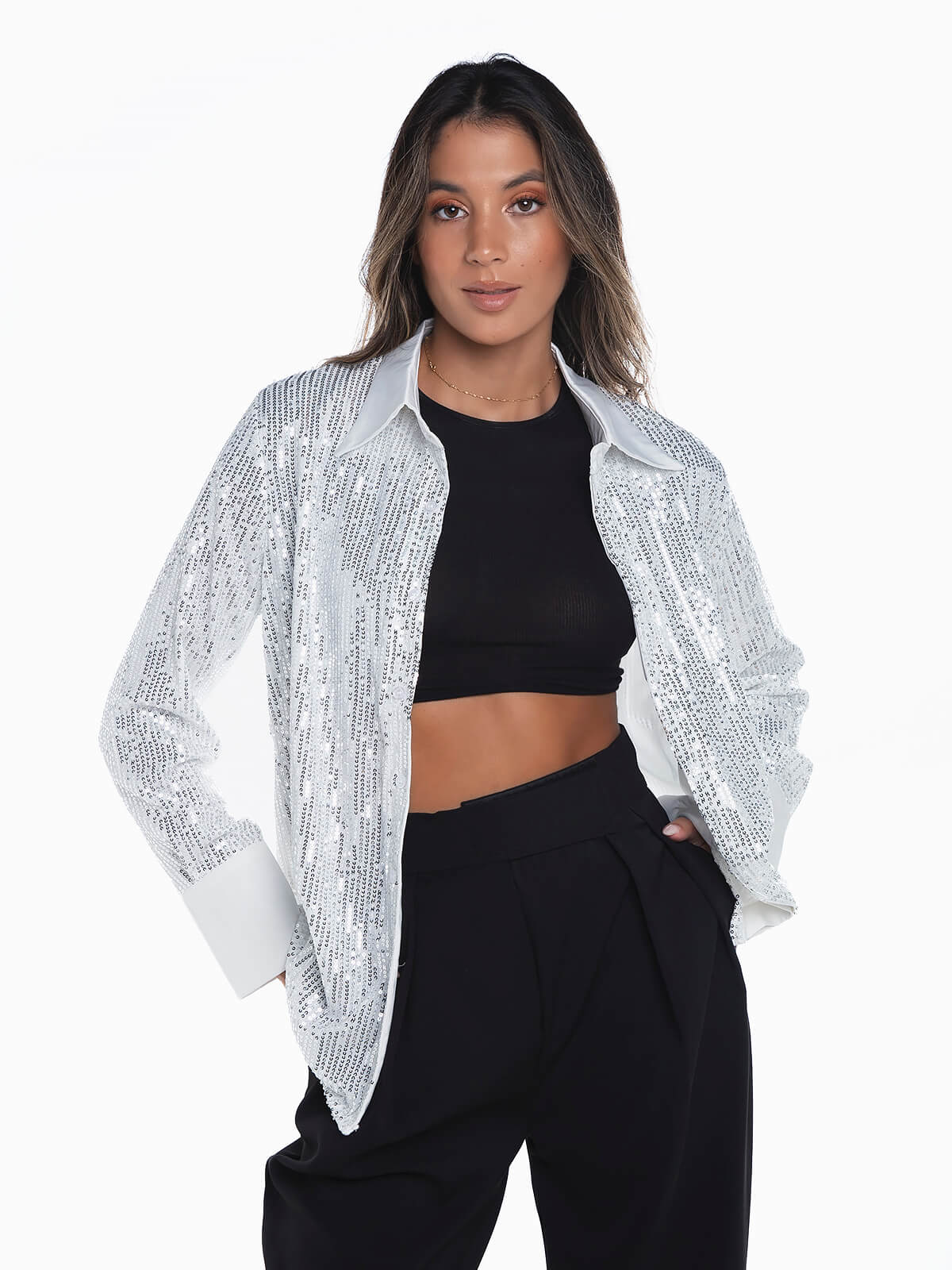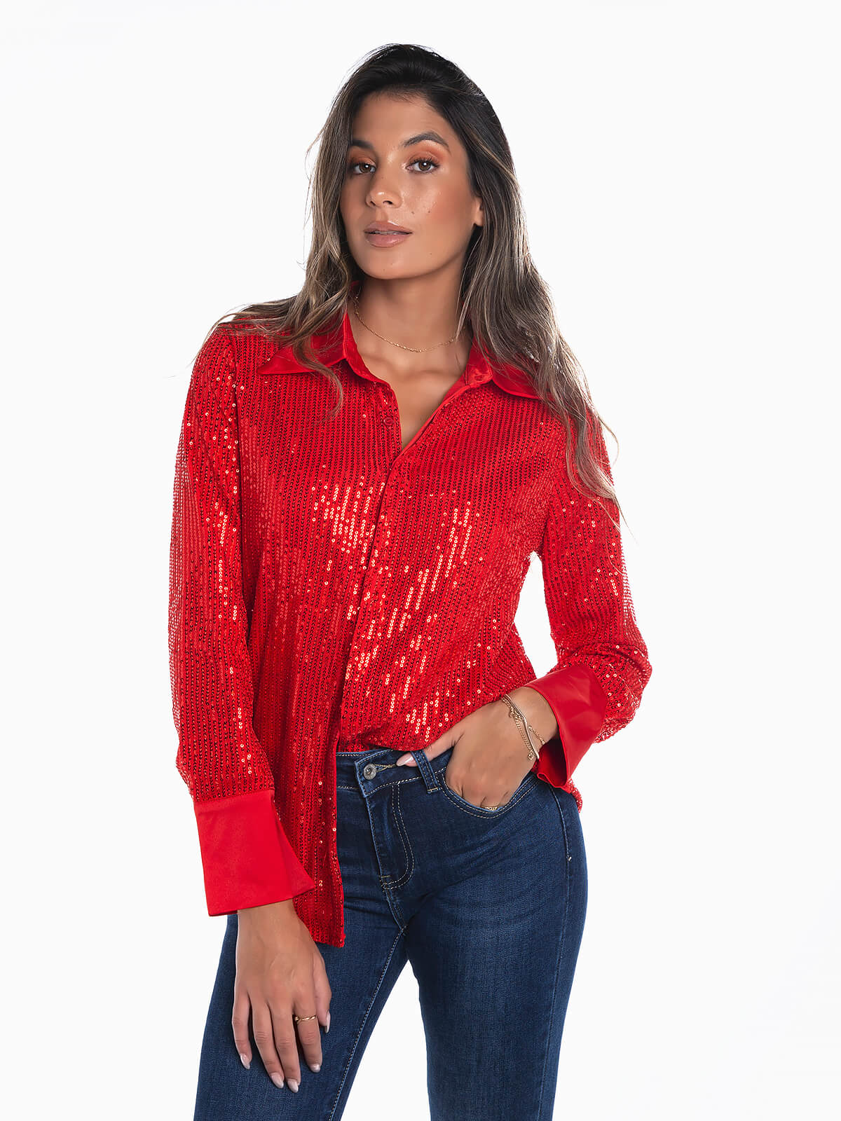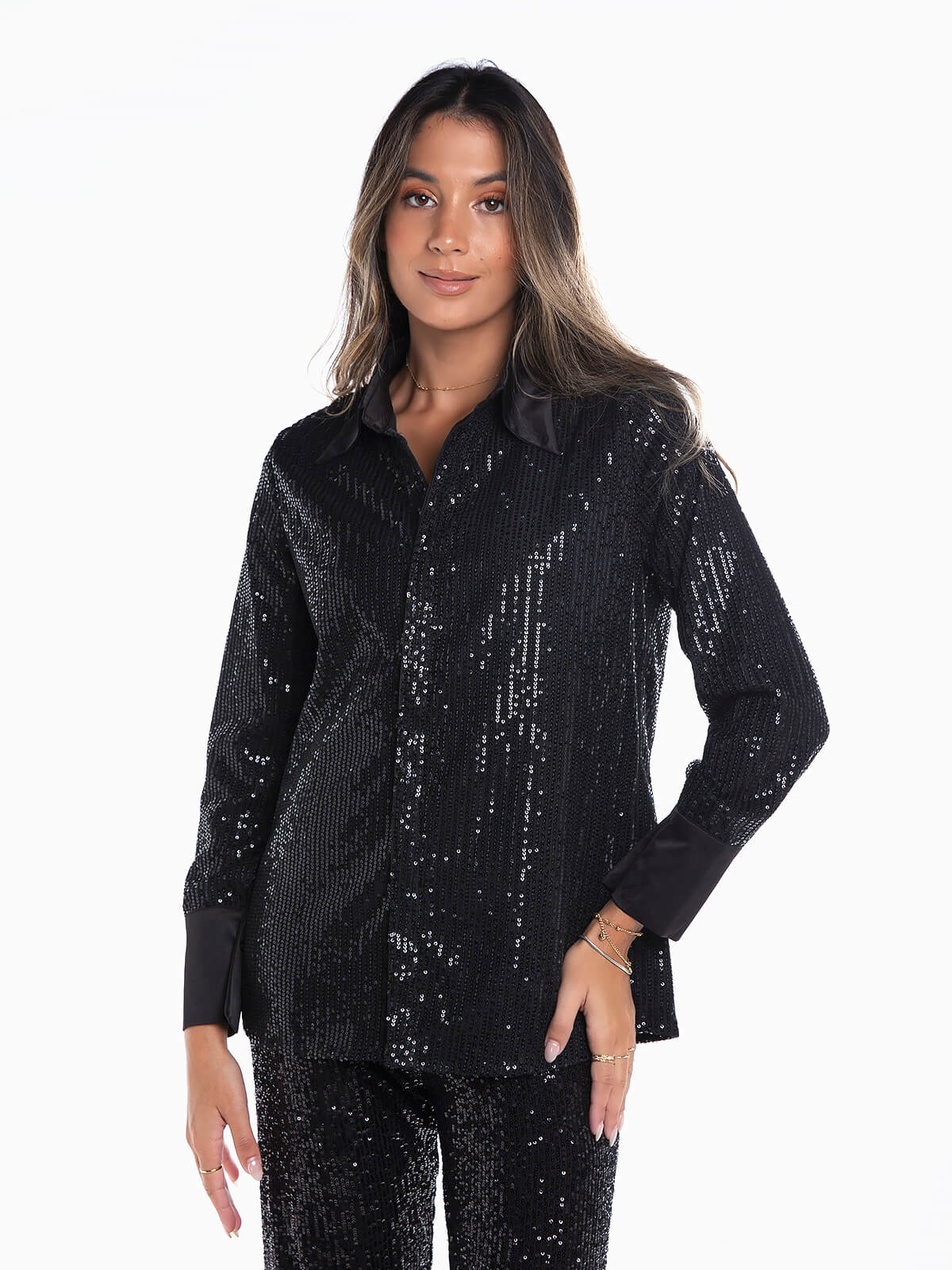 Camisa com lantejoulas para senhora. Camisa em tecido duplo manga comprida com punhos abotoados. Gola e punhos acetinados. Aperto de botões.