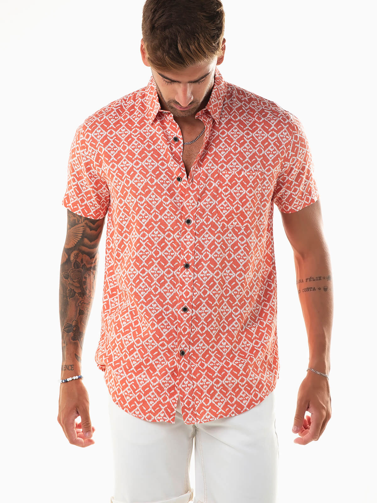 Camisa confecionada em tecido com mistura de linho para maior durabilidade e fácil manutenção. Camisa manga curta de verão com estampado étnico e bolso no peito. Gola abas e aperto frontal de botões.