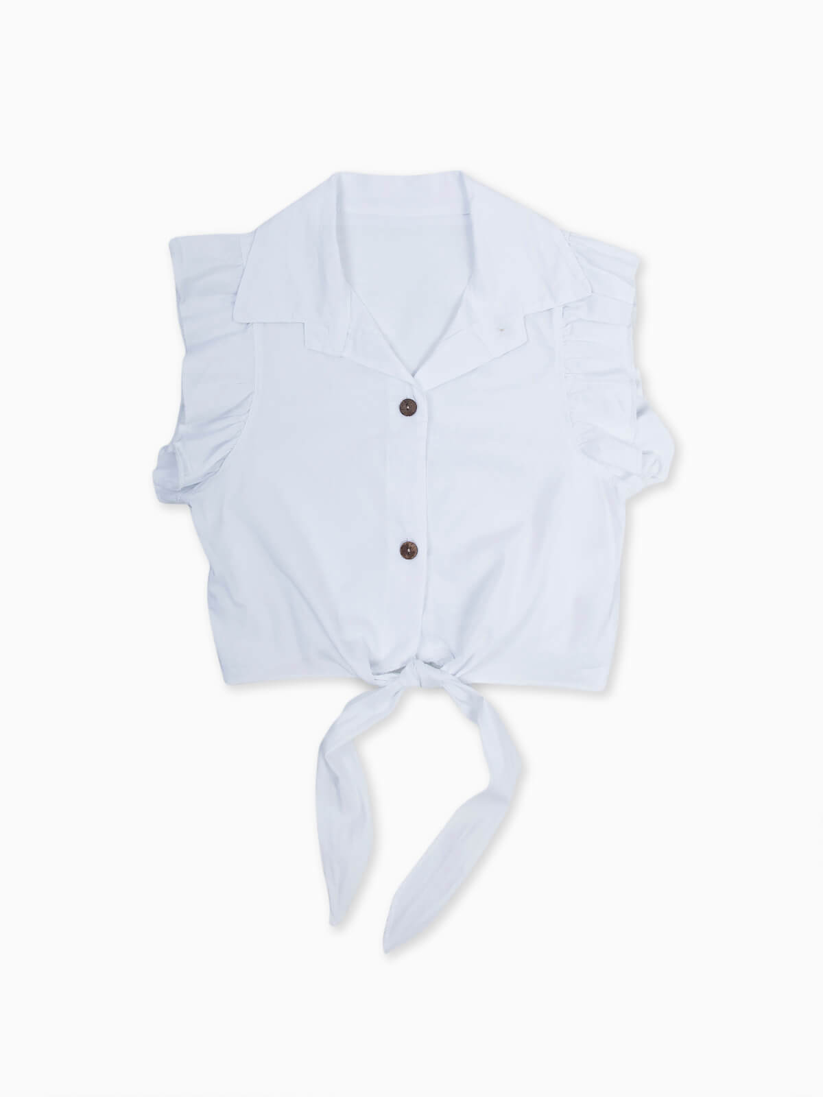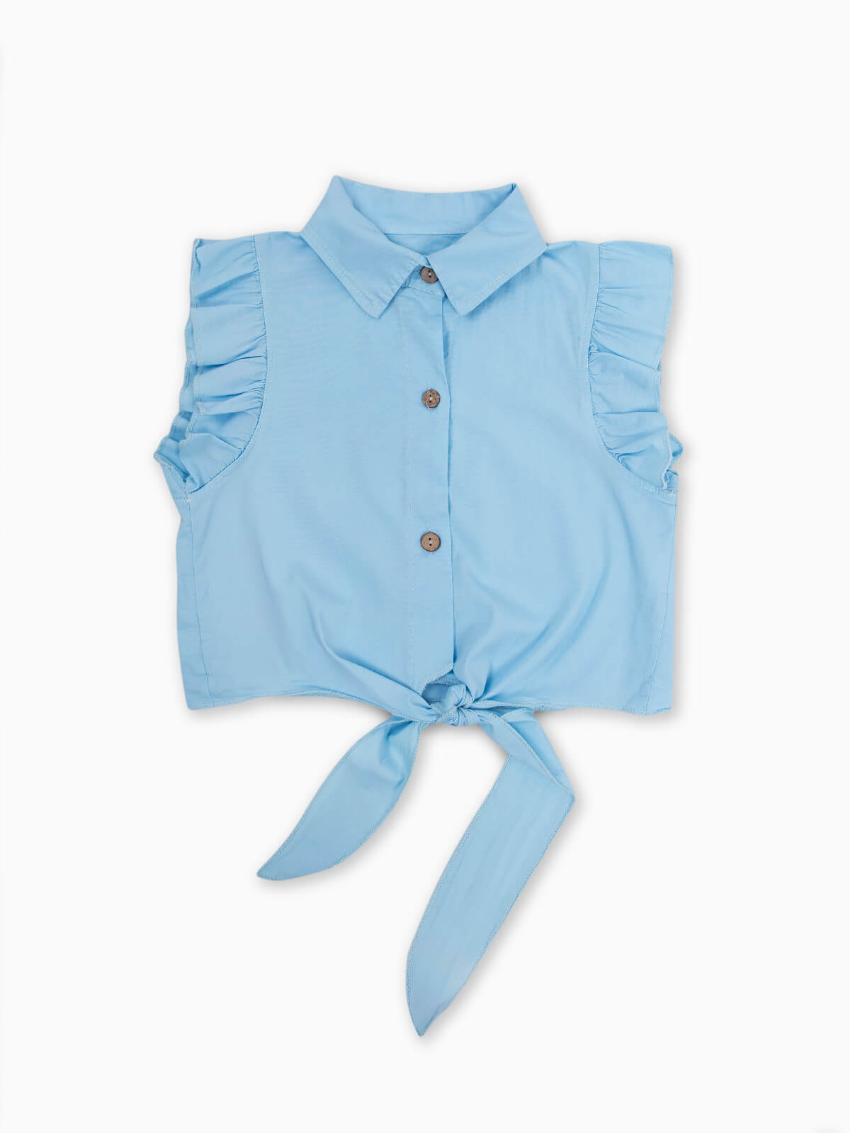 Camisa para menina com nó na base. Camisa sem mangas com encaixe de folho na base. Gola de abas. Aperto frontal de botões.