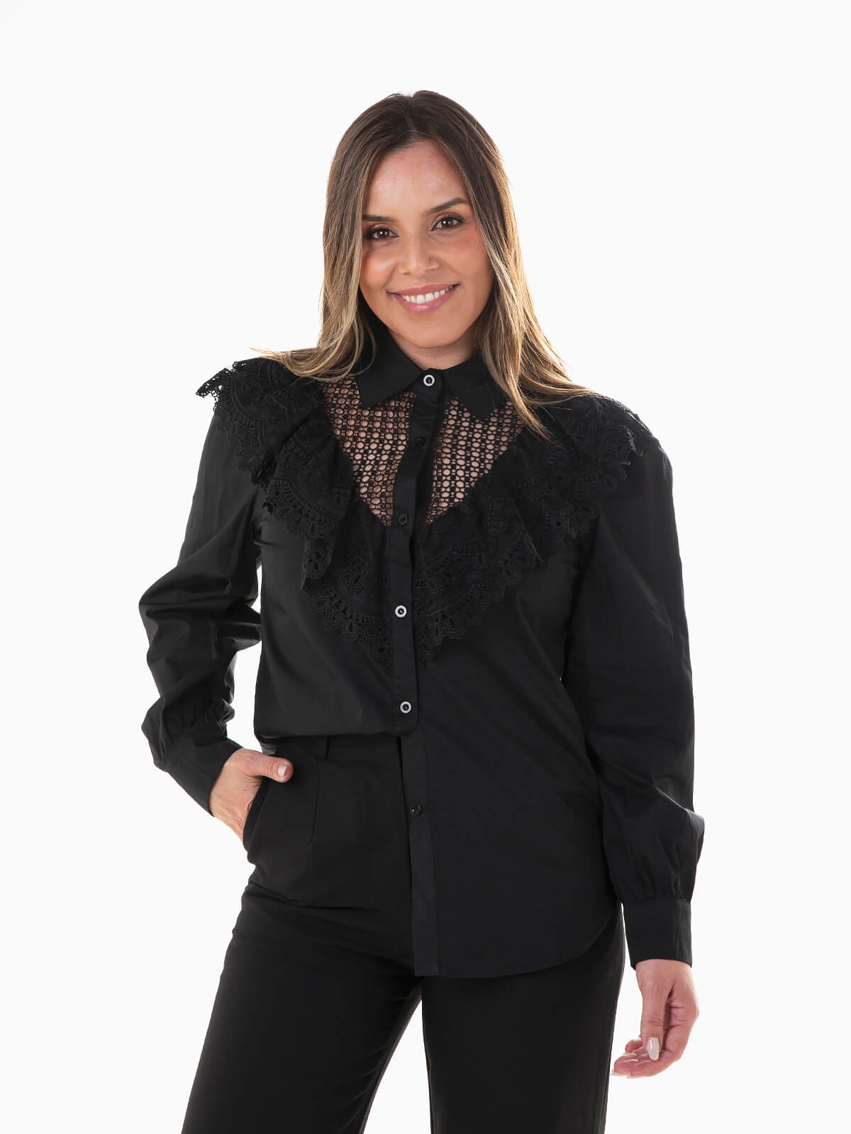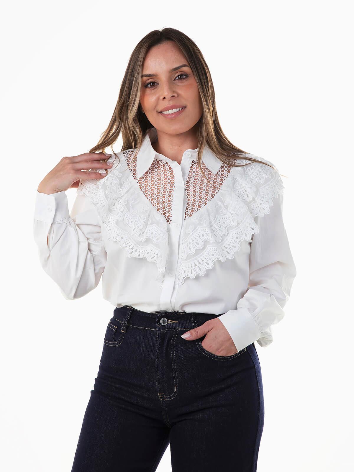 Camisa para senhora combinada com renda à frente. Camisa de manga comprida com punhos abotoados e gola abas. Aperto frontal de botões.
