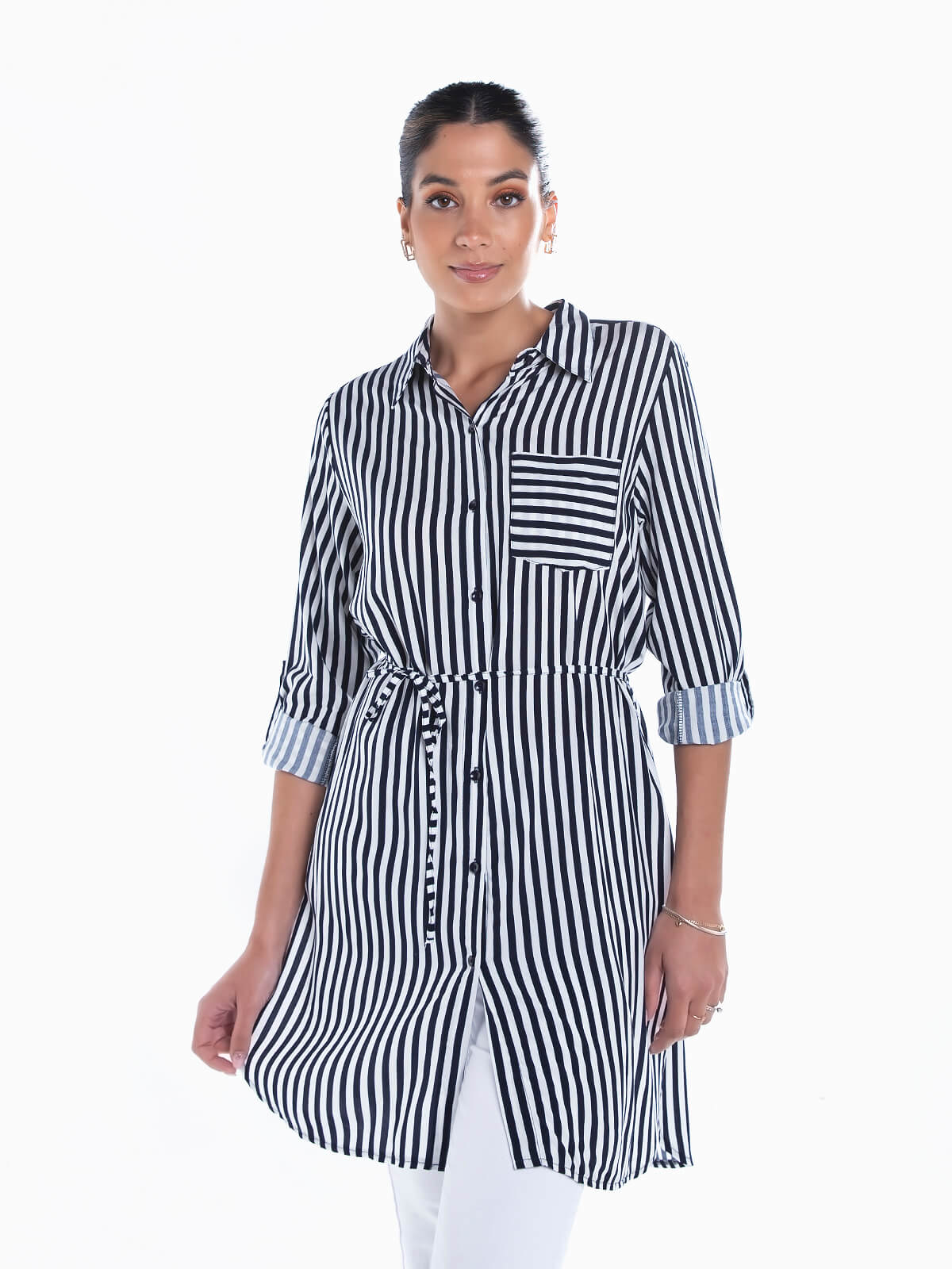 Camisa comprida às riscas com cinto no mesmo tecido para ajustar. Camisa de manga comprida com punhos abotoados e presilhas. Bolso no peito. Gola de abas. Aperto frontal de botões.