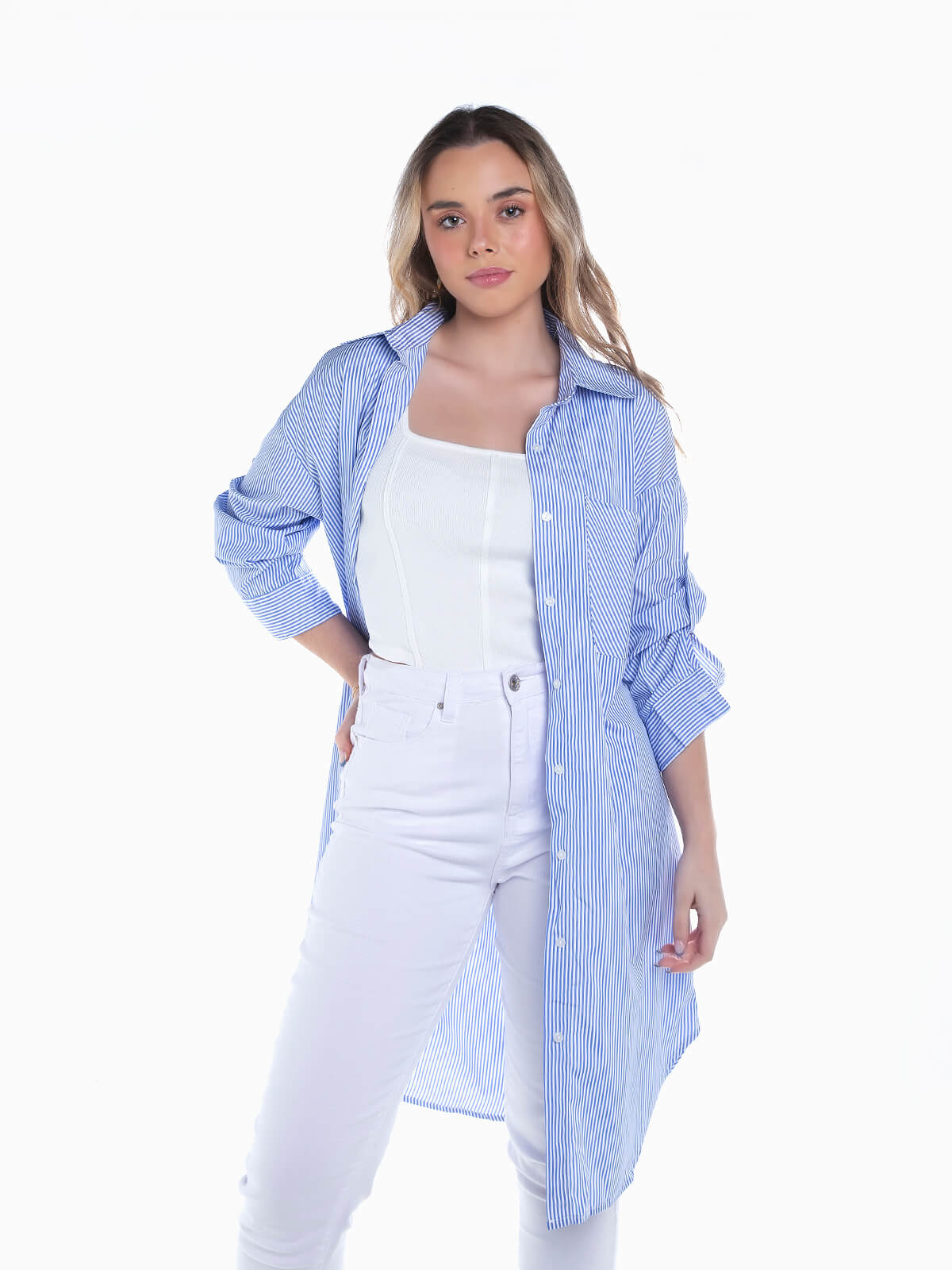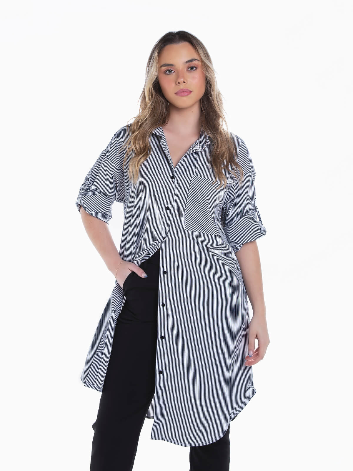 Camisa comprida às riscas com bolso no peito para senhora. Camisa com manga comprida e presilhas. Punhos abotoados. Cós arredondado. Aperto frontal de botões.
