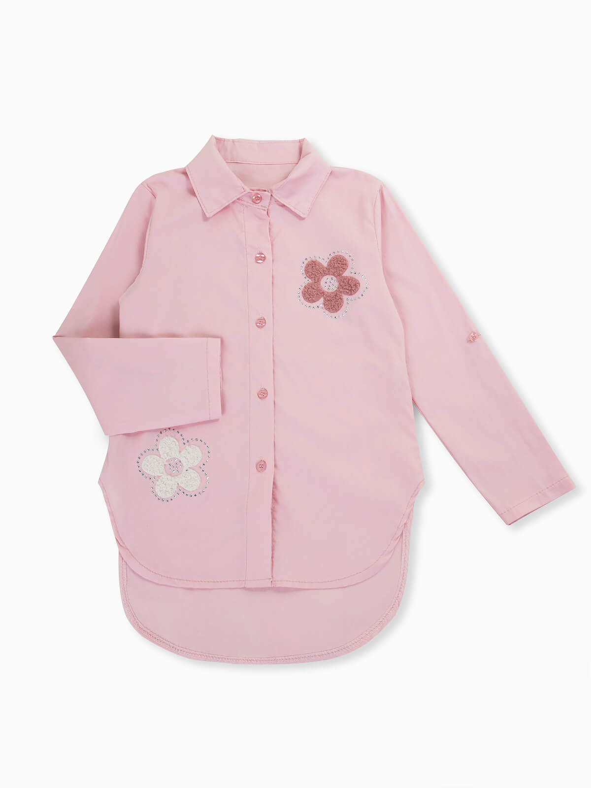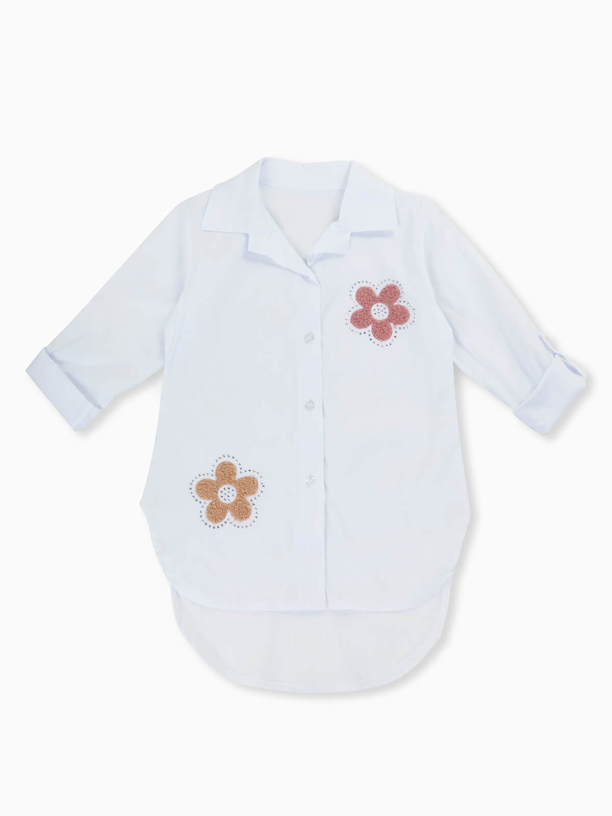 Camisa comprida com encaixe de flores em tecido terrycloth e brilhos. Camisa manga comprida com presilhas para ajustar. Gola abas. Aperto de botões.