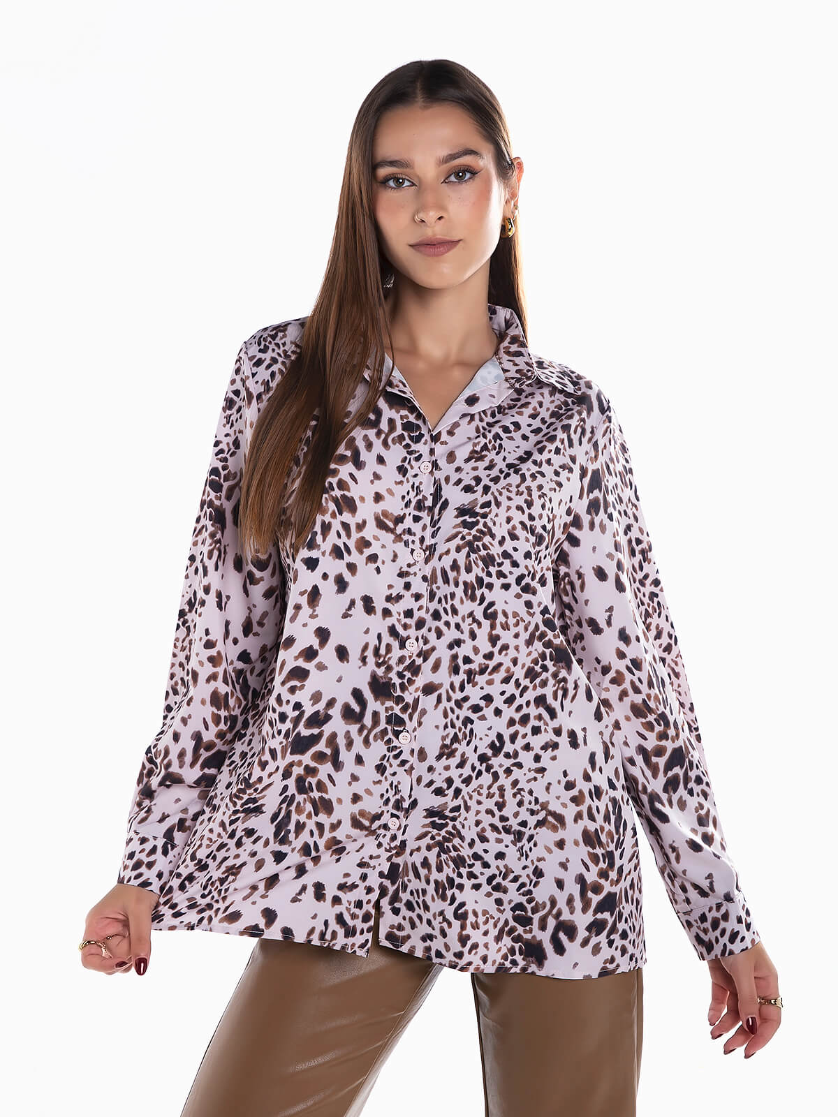 Camisa comprida rosa com animal print. Camisa manga comprida para senhora com punhos abotoados. Gola de abas. Aperto frontal de botões.