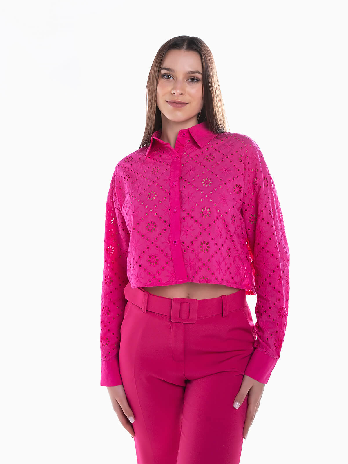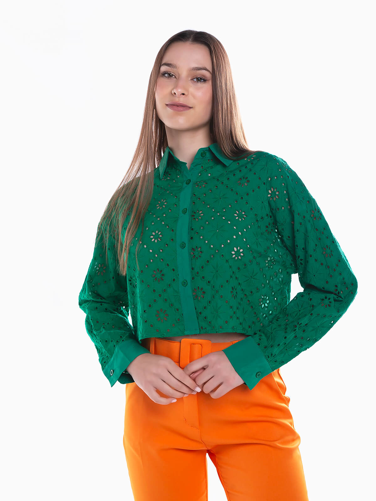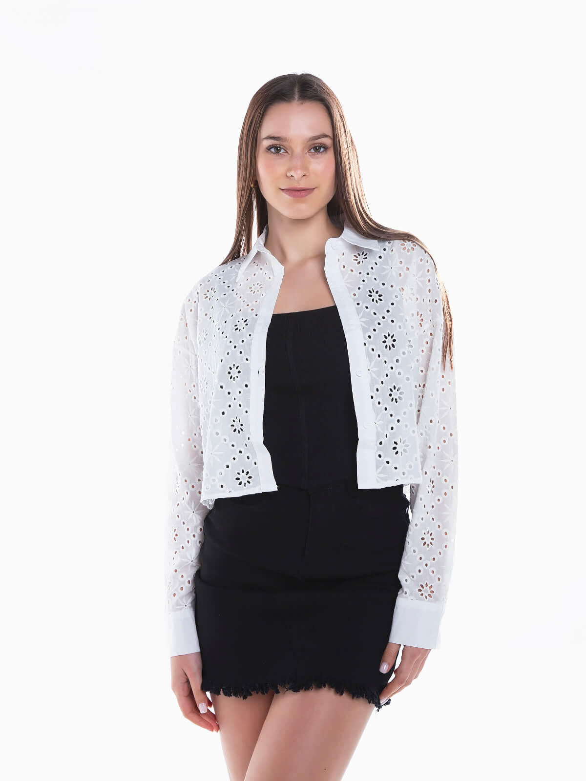 Camisa cropped em bordado inglês. Camisa de manga comprida com gola de abas. Punhos abotoados. Aperto frontal de botões.