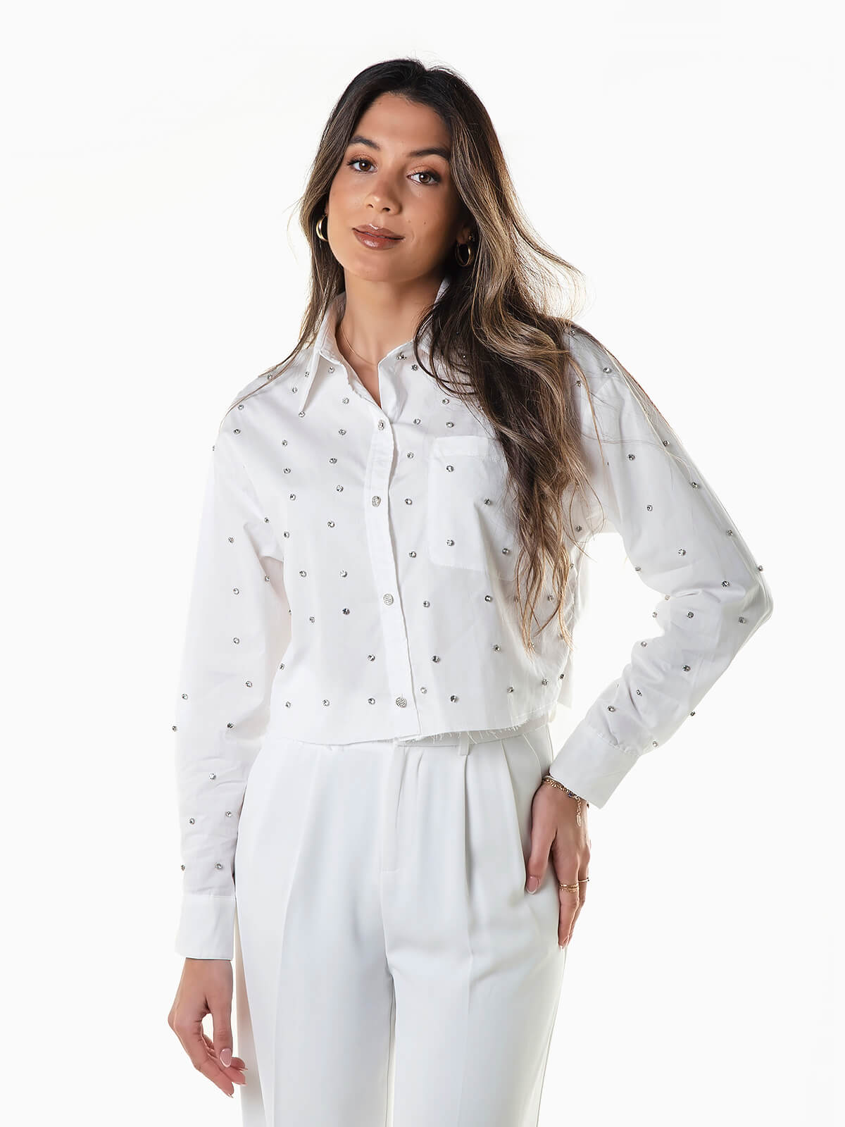 Camisa cropped com aplicações de pedras brilhantes. Camisa manga comprida com punhos abotoados. Gola abas e bolso no peito. Base desfiada. Aperto de botões de jóia.