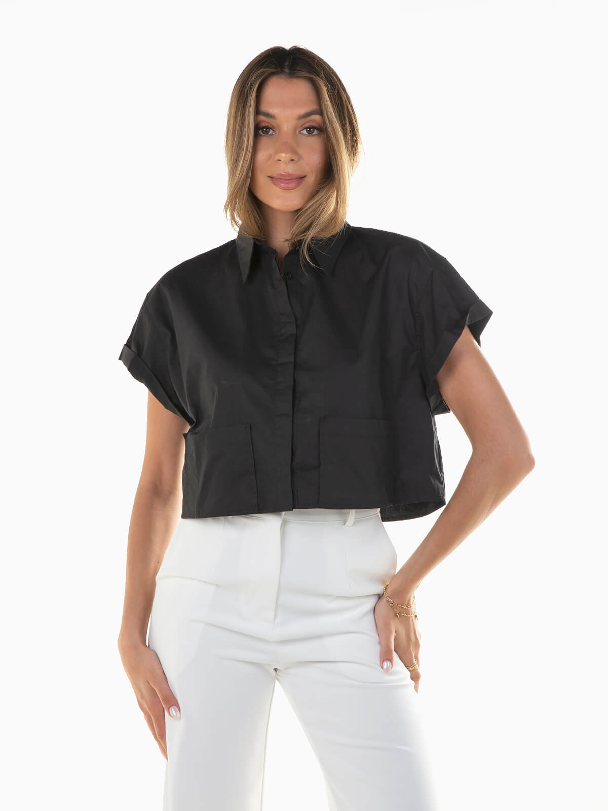 Camisa cropped com 2 bolsos à frente. Camisa de manga curta com gola de abas. Aperto frontal de botões.