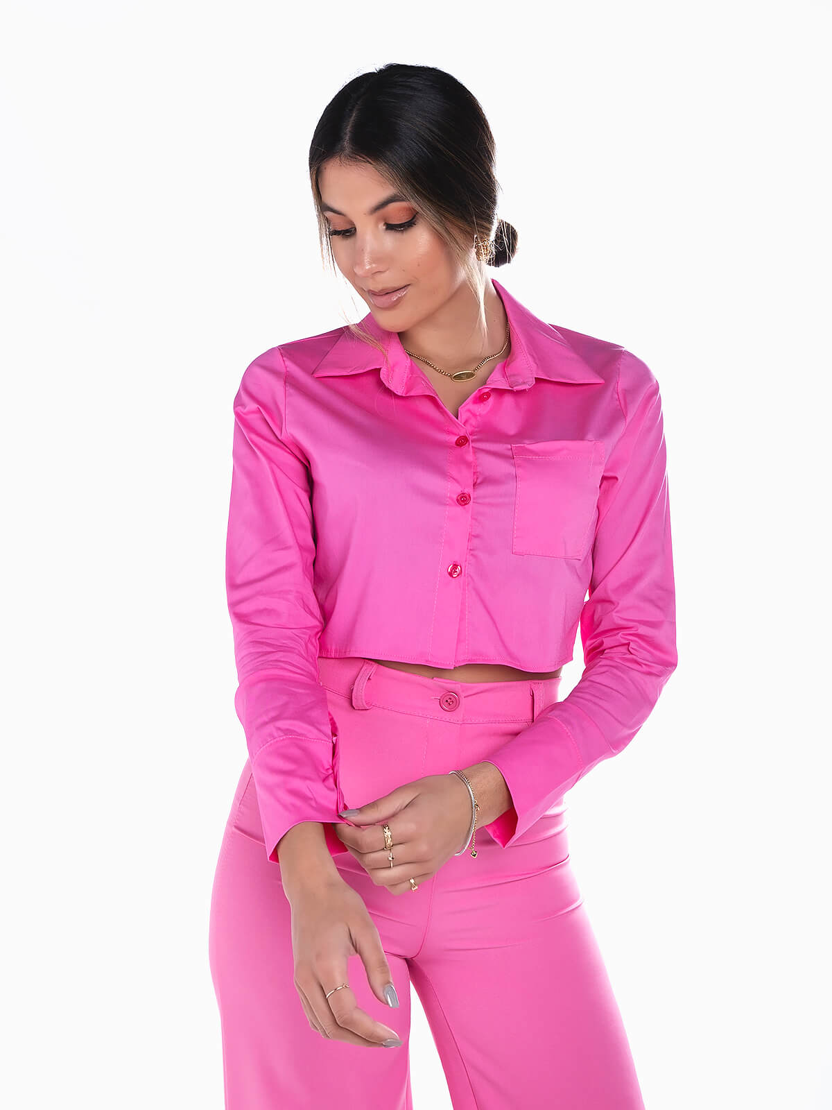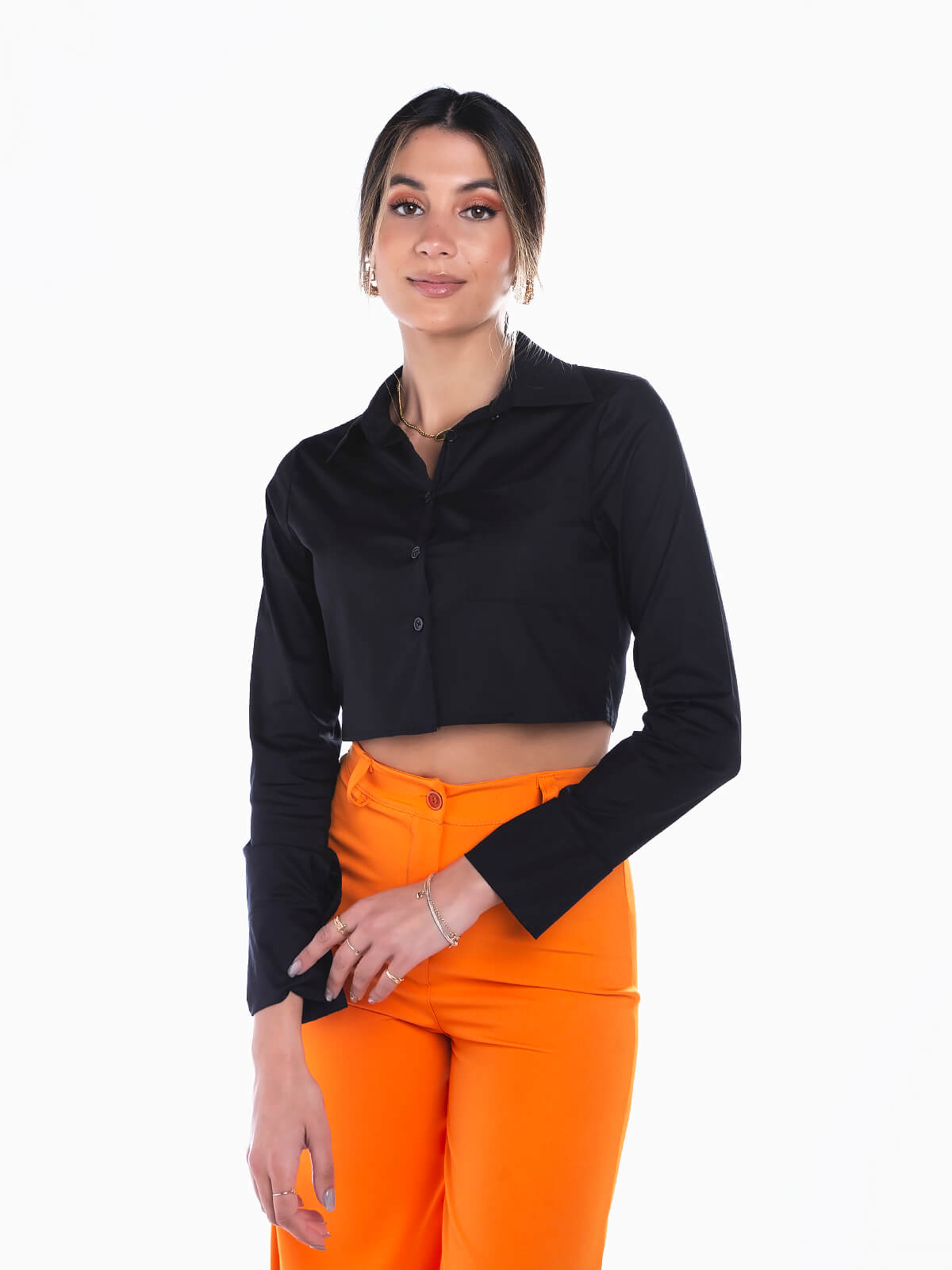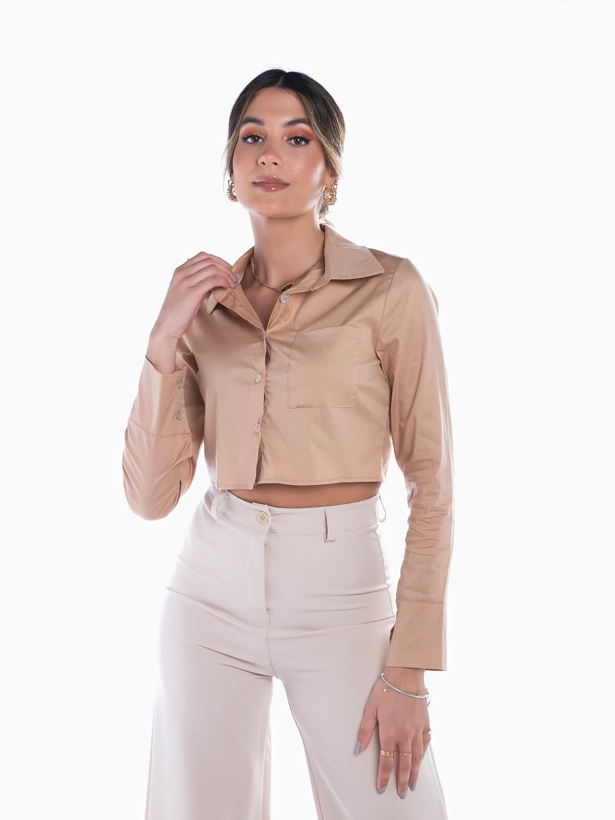 Camisa cropped de manga comprida com punhos abotoados. Camisa com gola de abas e pormenor de bolso no peito. Aperto frontal de botões.