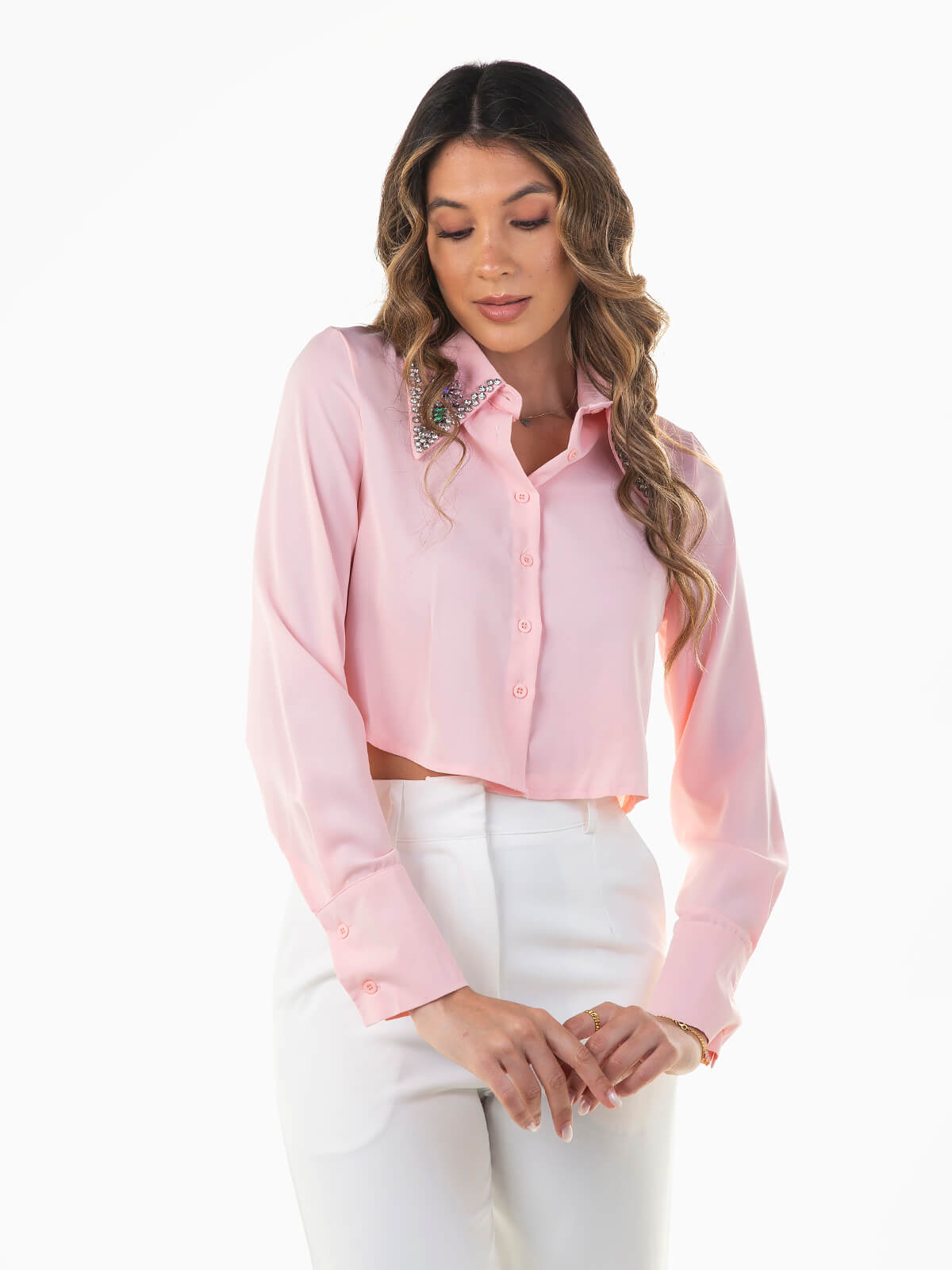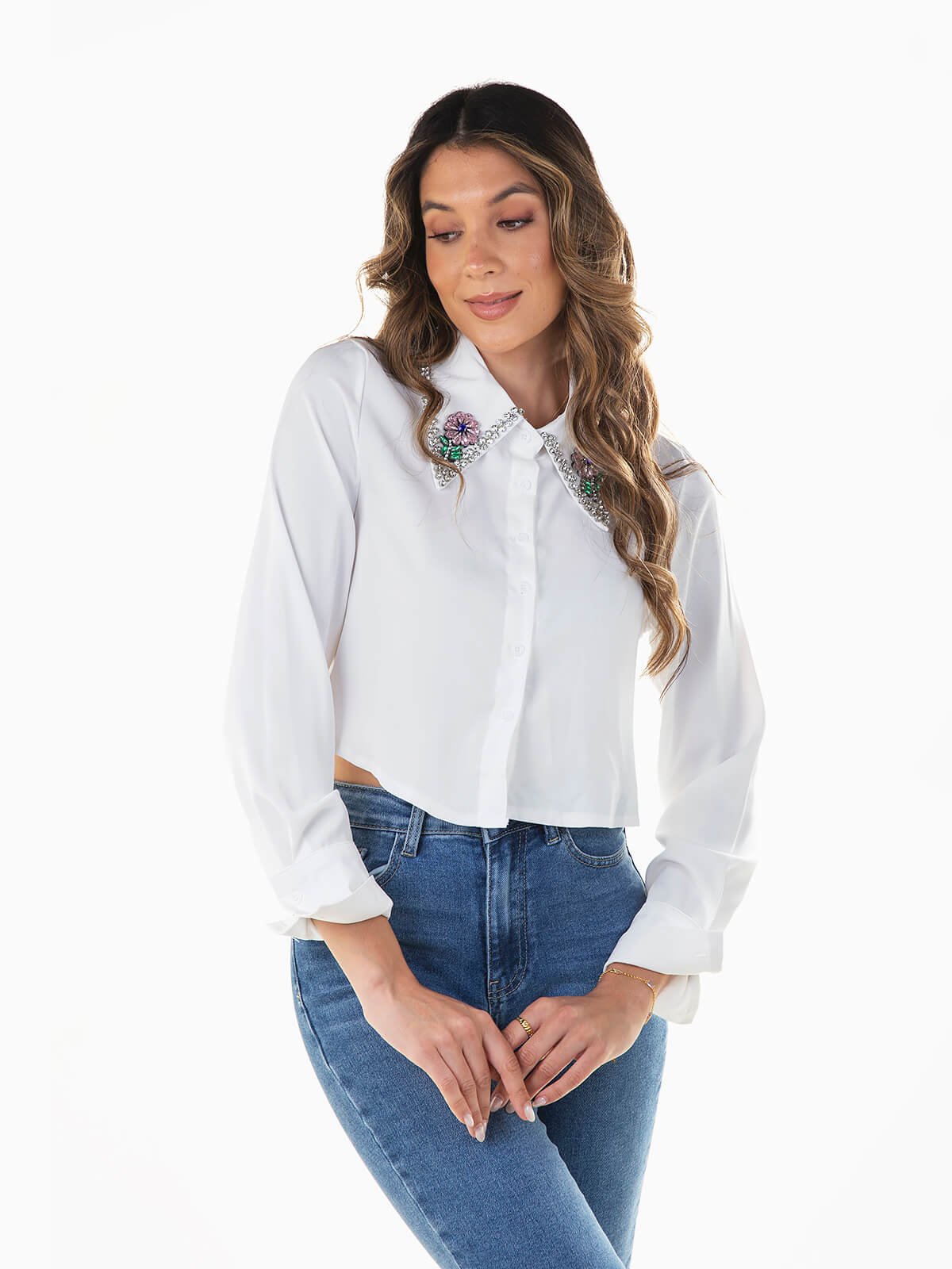 Camisa curta com aplicações de strass na gola. Camisa de manga comprida com punhos abotoados e aperto frontal de botões.