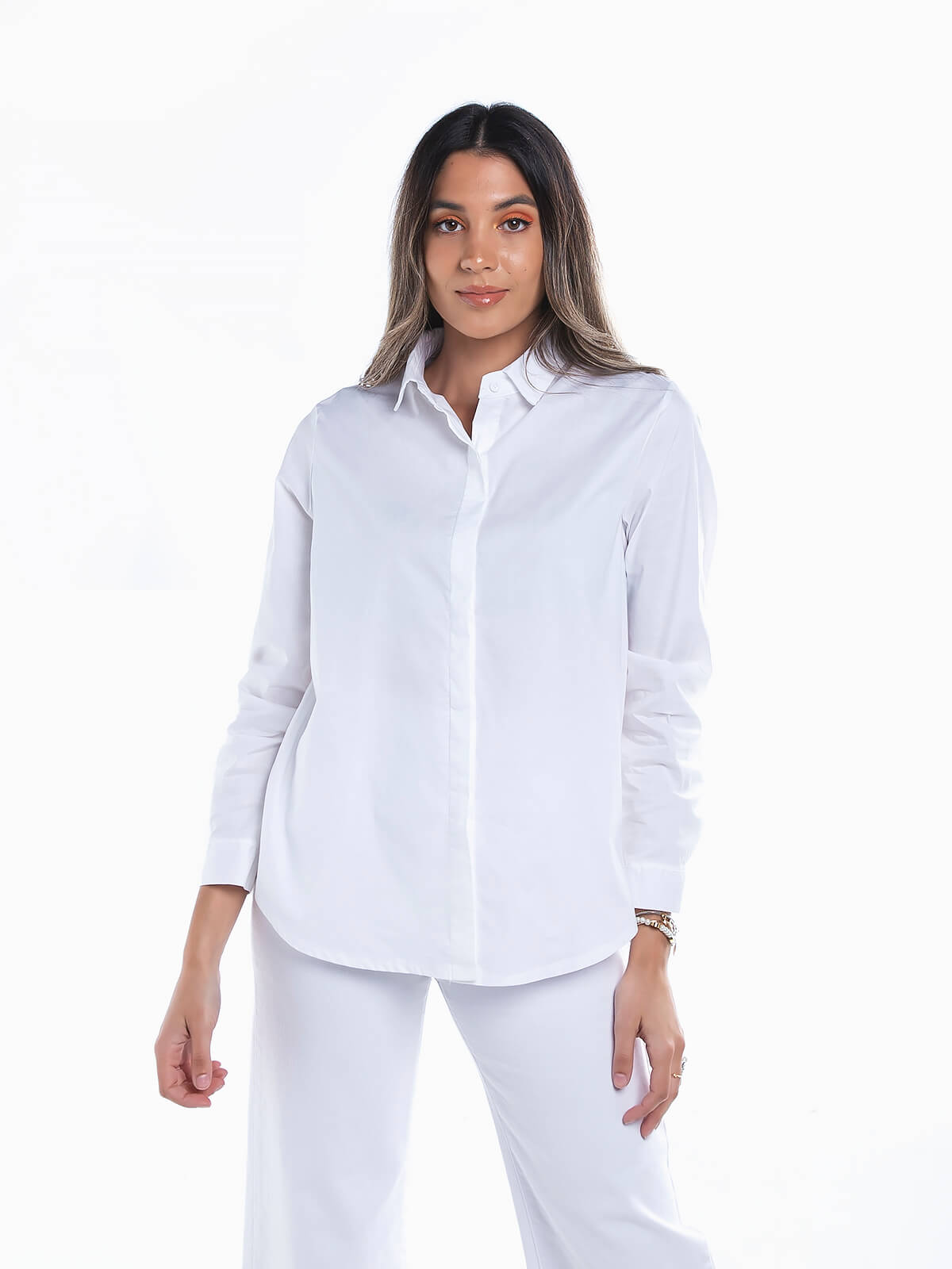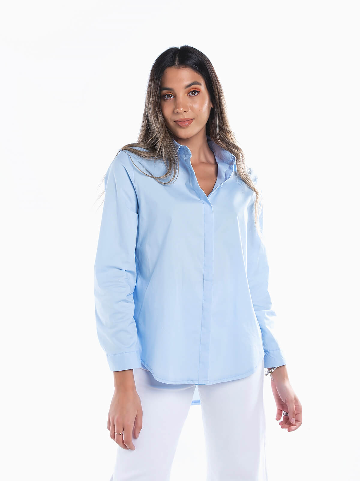 Camisa de popelina básica para senhora. Camisa de manga comprida e gola camiseiro. Aperto de botões. Punhos abotoados. Mais comprida atrás. Cós arredondado.