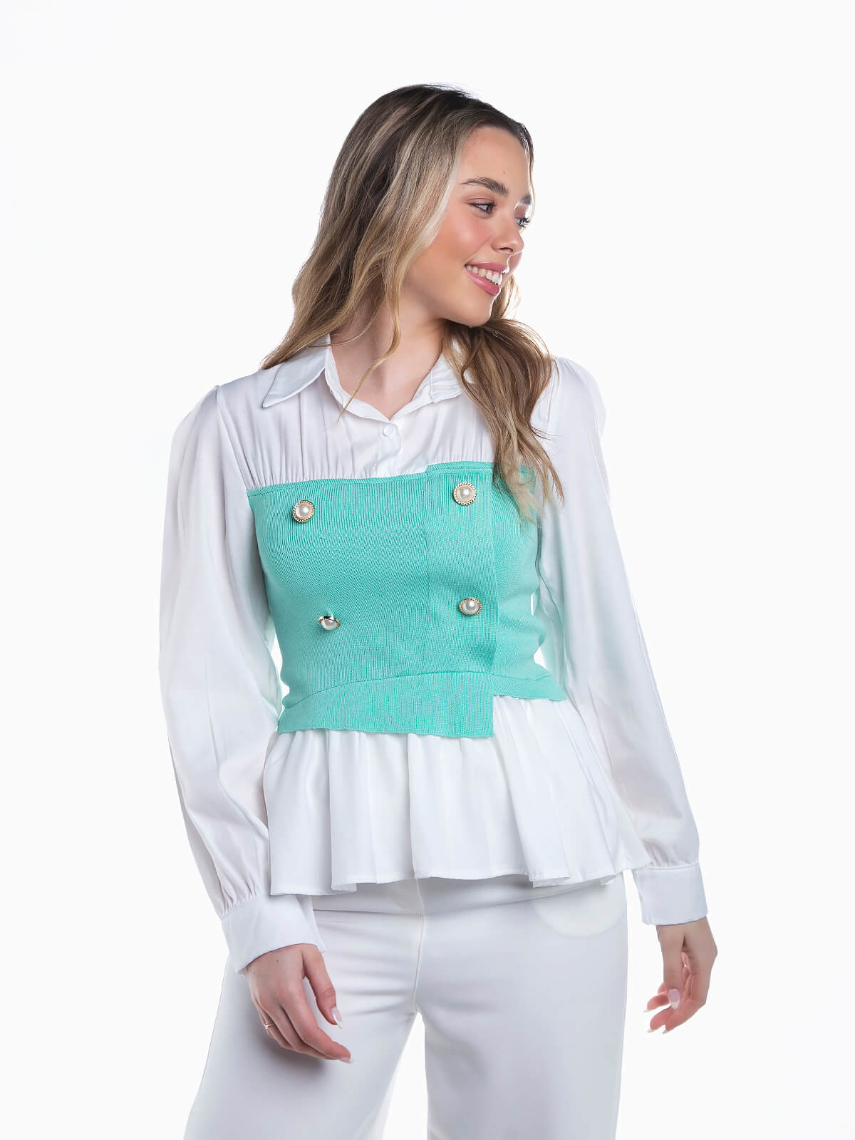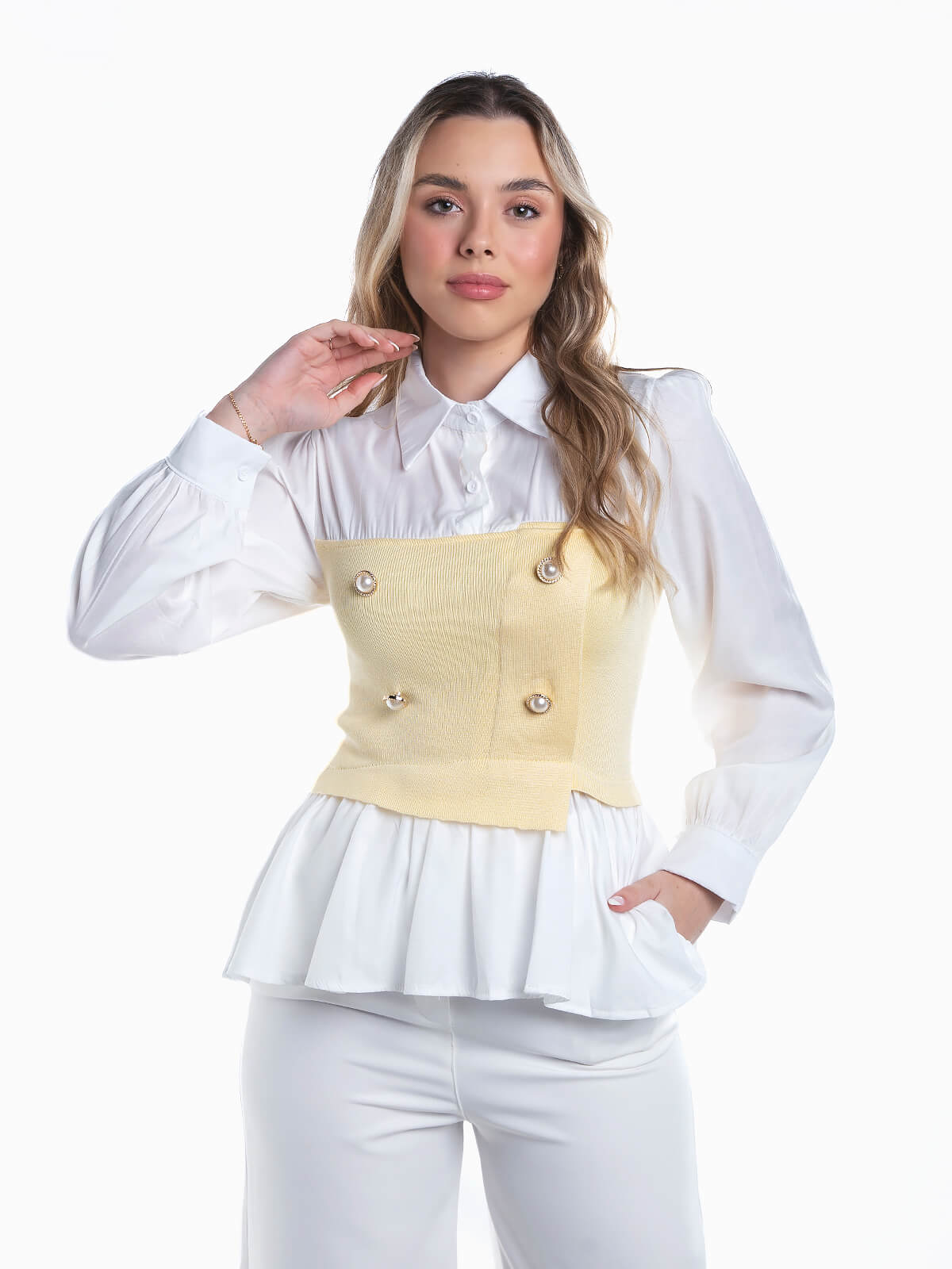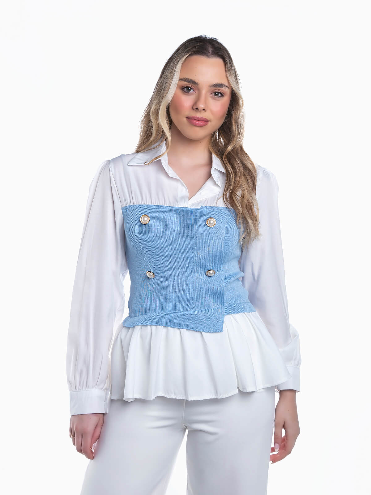 Camisa de manga comprida com encaixe em malha para efeito corpete. Camisa com punhos abotoados e gola de abas. Botões decorativos aplicados.