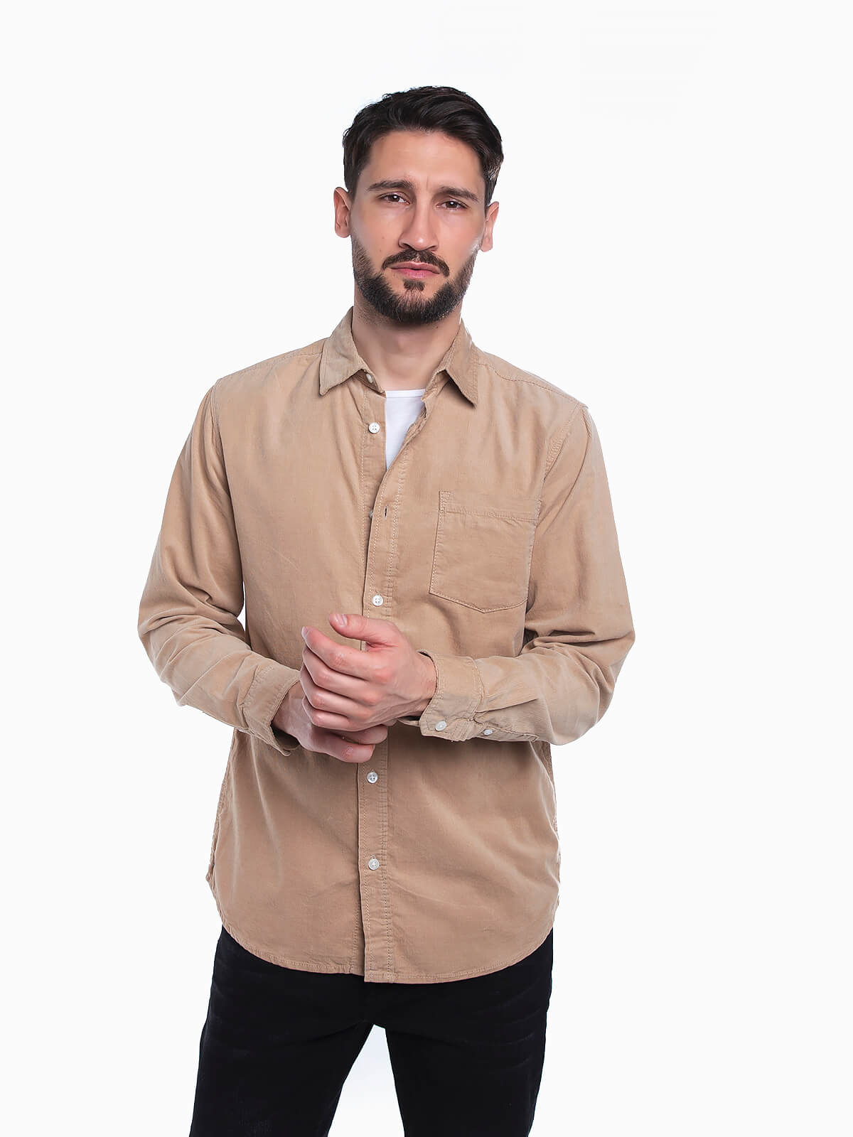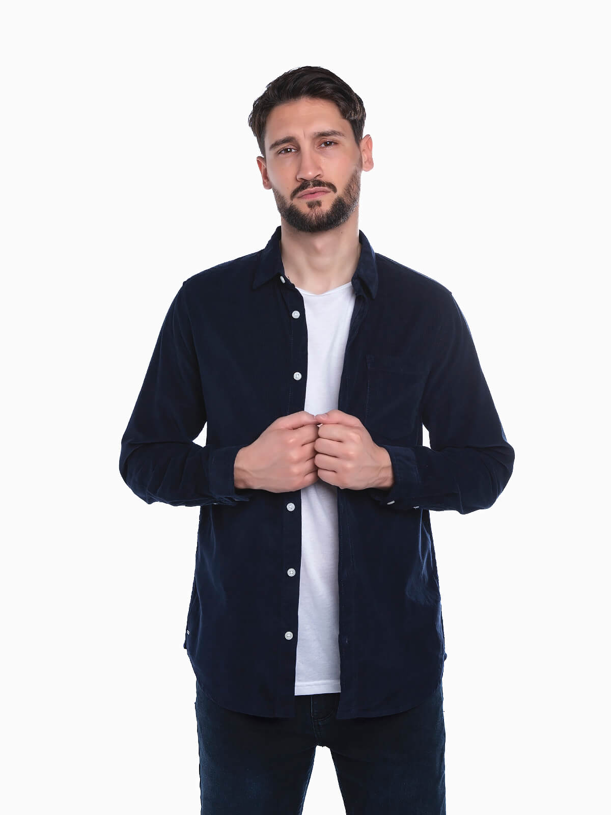 Camisa em bombazina fina para homem. Camisa manga comprida com bolso aplicado no peito. Gola de abas. Punhos abotoados. Cós arredondado. Aperto frontal de botões.