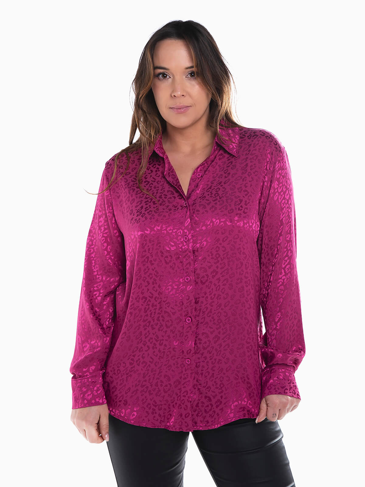 Camisa com estampado leopardo à cor. Camisa fluída brilhante manga comprida com punhos abotoados. Gola abas. Punhos abotoados. Aperto frontal de botões.
