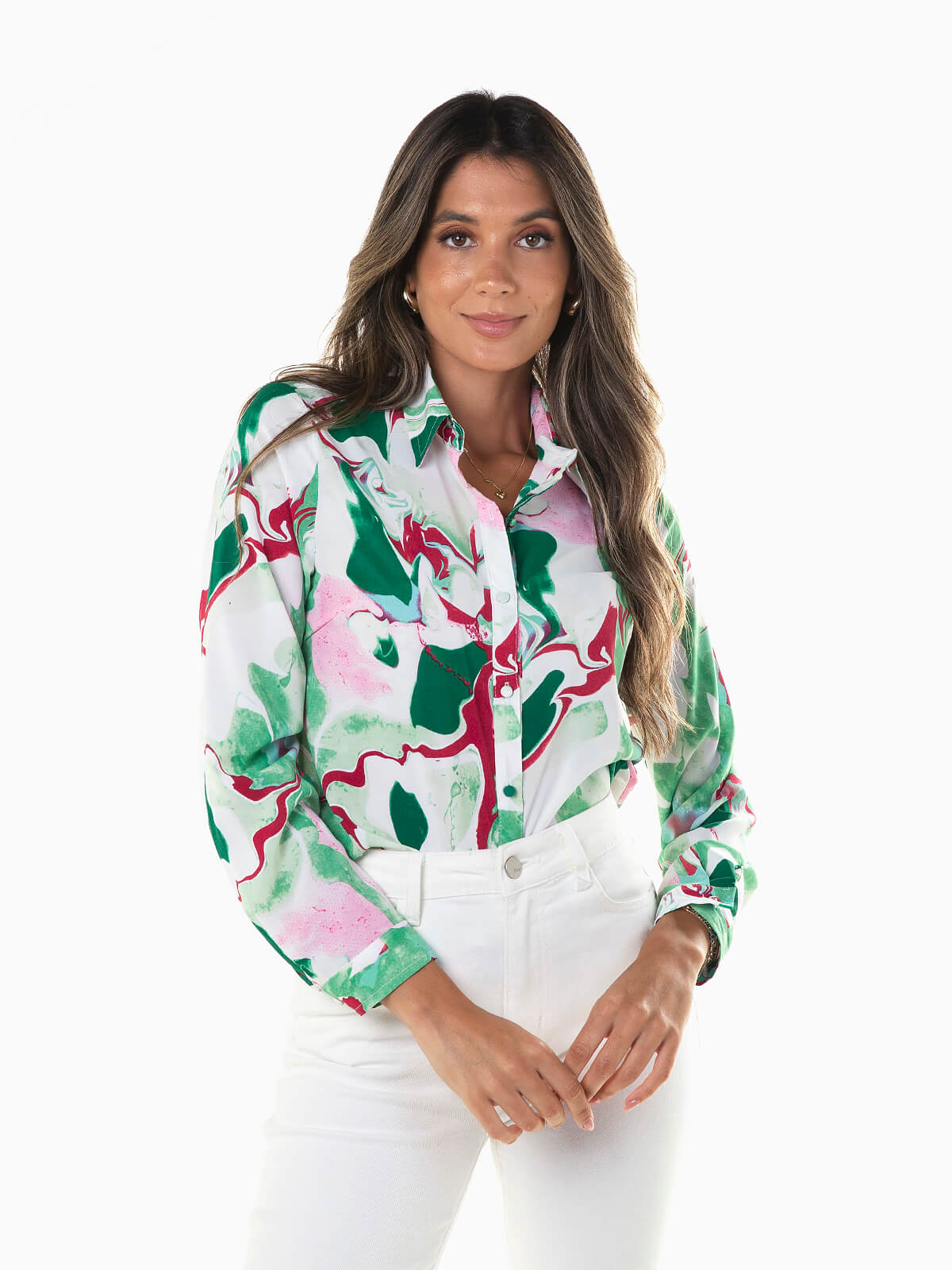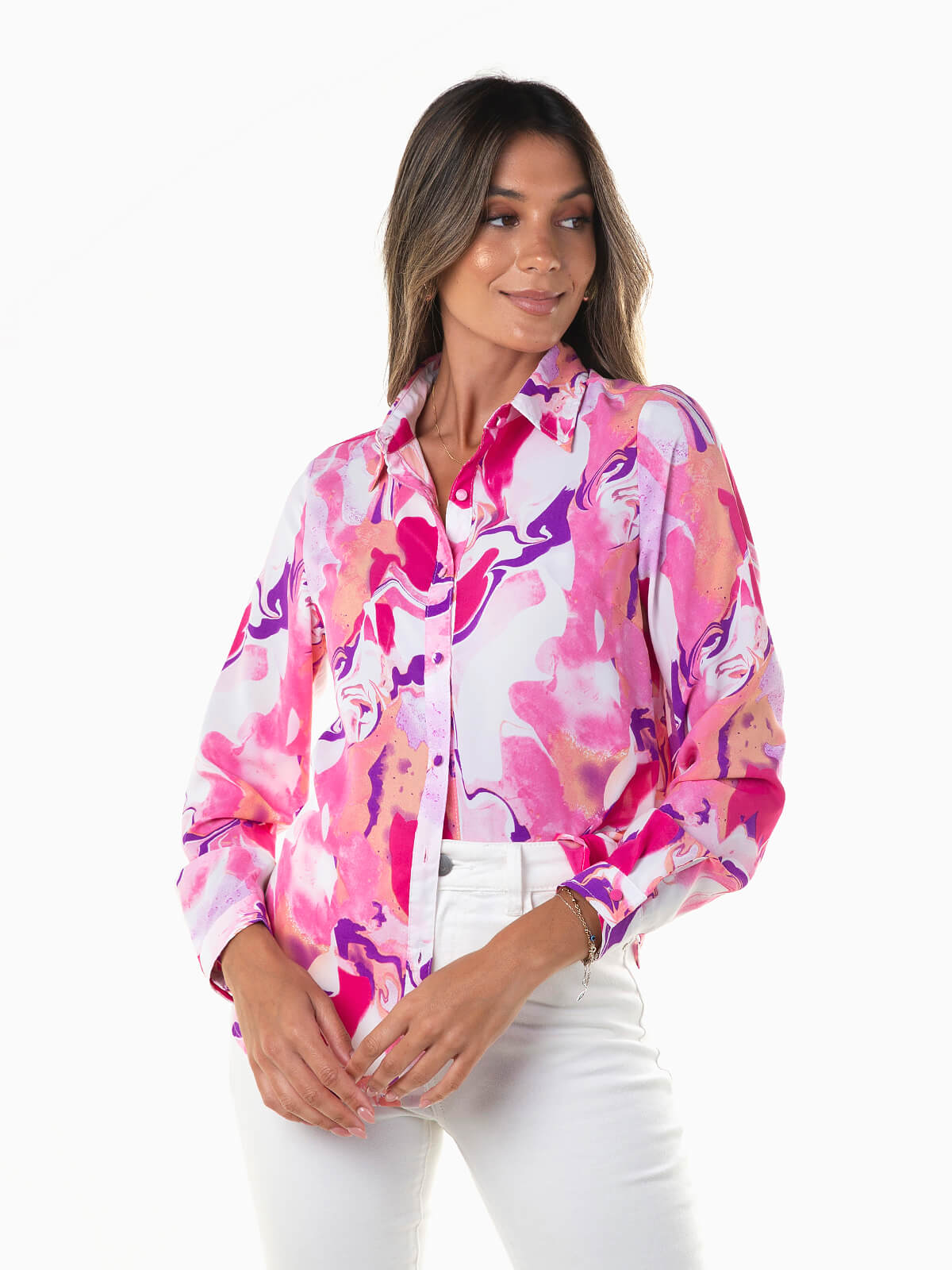 Camisa com estampado efeito mármore para senhora. Camisa manga comprida 100% algodão. Punhos abotoados e gola de abas. Aperto frontal de botões.