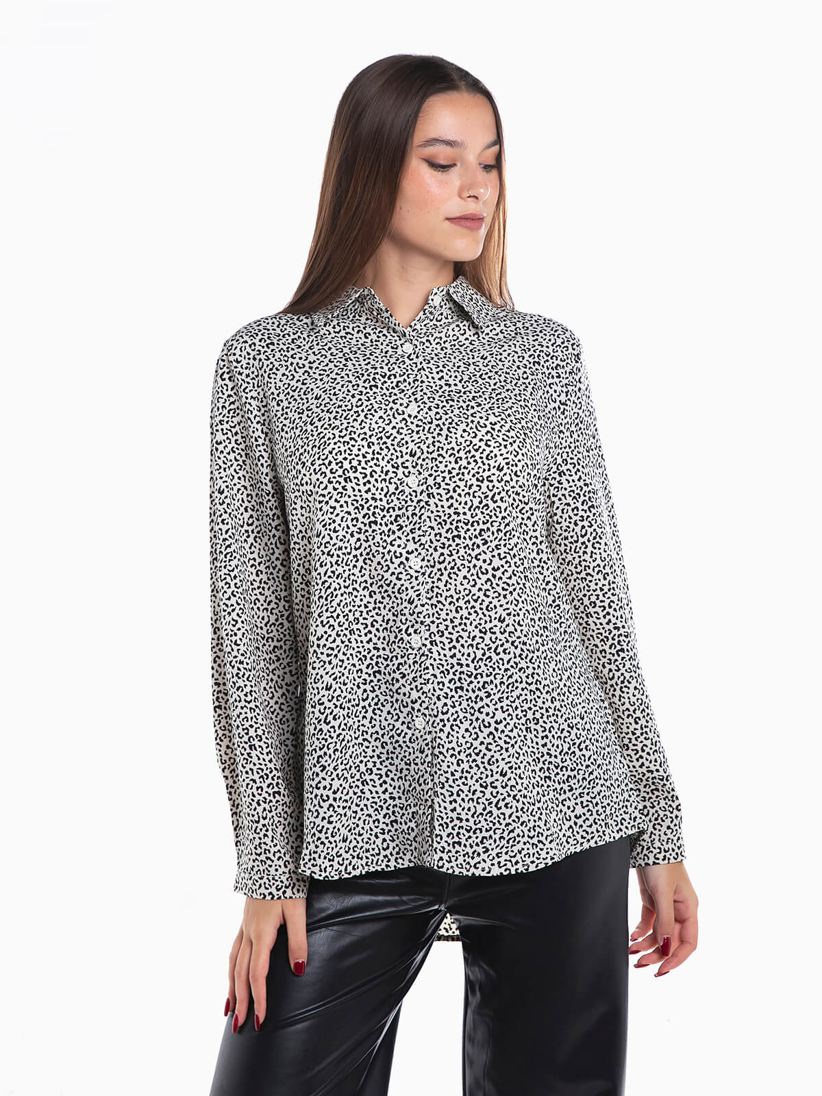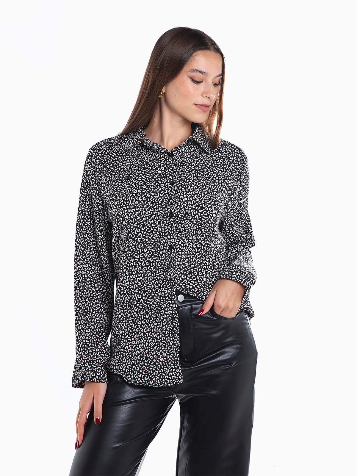 Camisa com estampado leopardo para senhora. Camisa de manga comprida com punhos abotoados. Gola abas. Aperto frontal de botões.