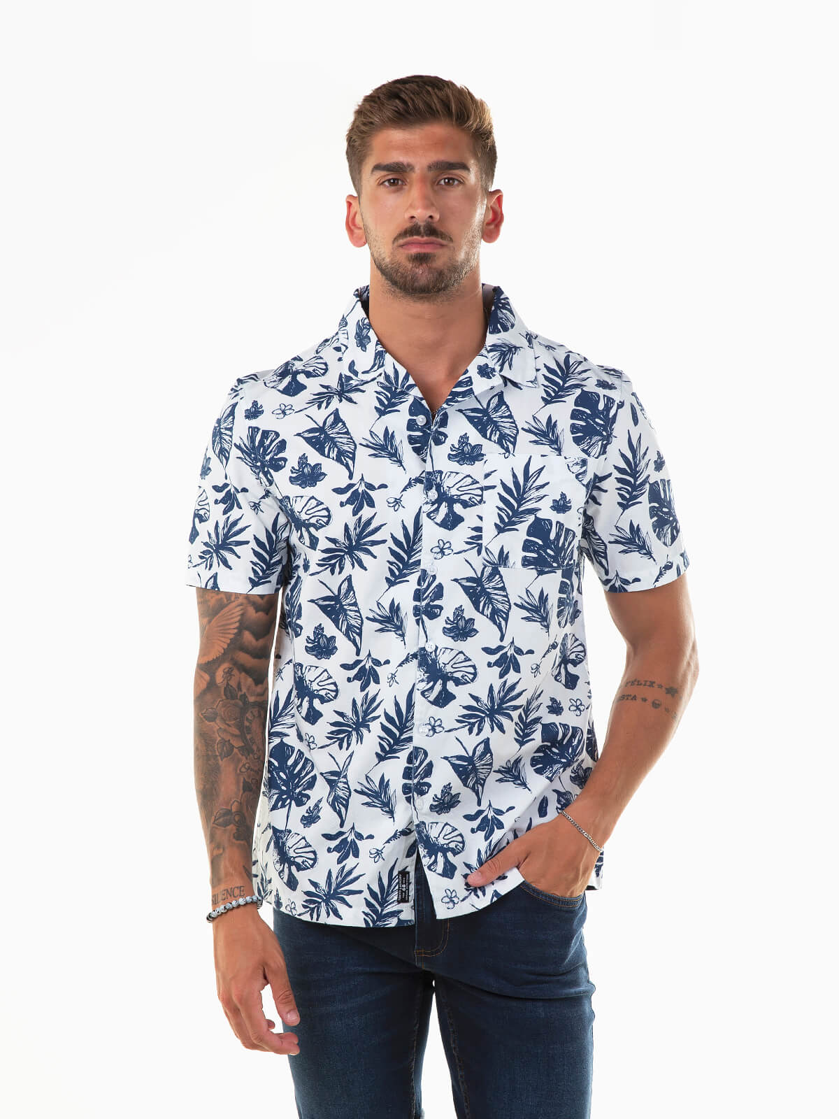 Camisa de manga curta 100% algodão para homem. Camisa de verão com estampado tropical e gola abas. Bolso no peito. Aperto frontal de botões. Ideal para dias de férias, sunsets ou jantares à beira-mar – esta camisa adapta-se tanto a momentos descontraídos como a ocasiões mais especiais.