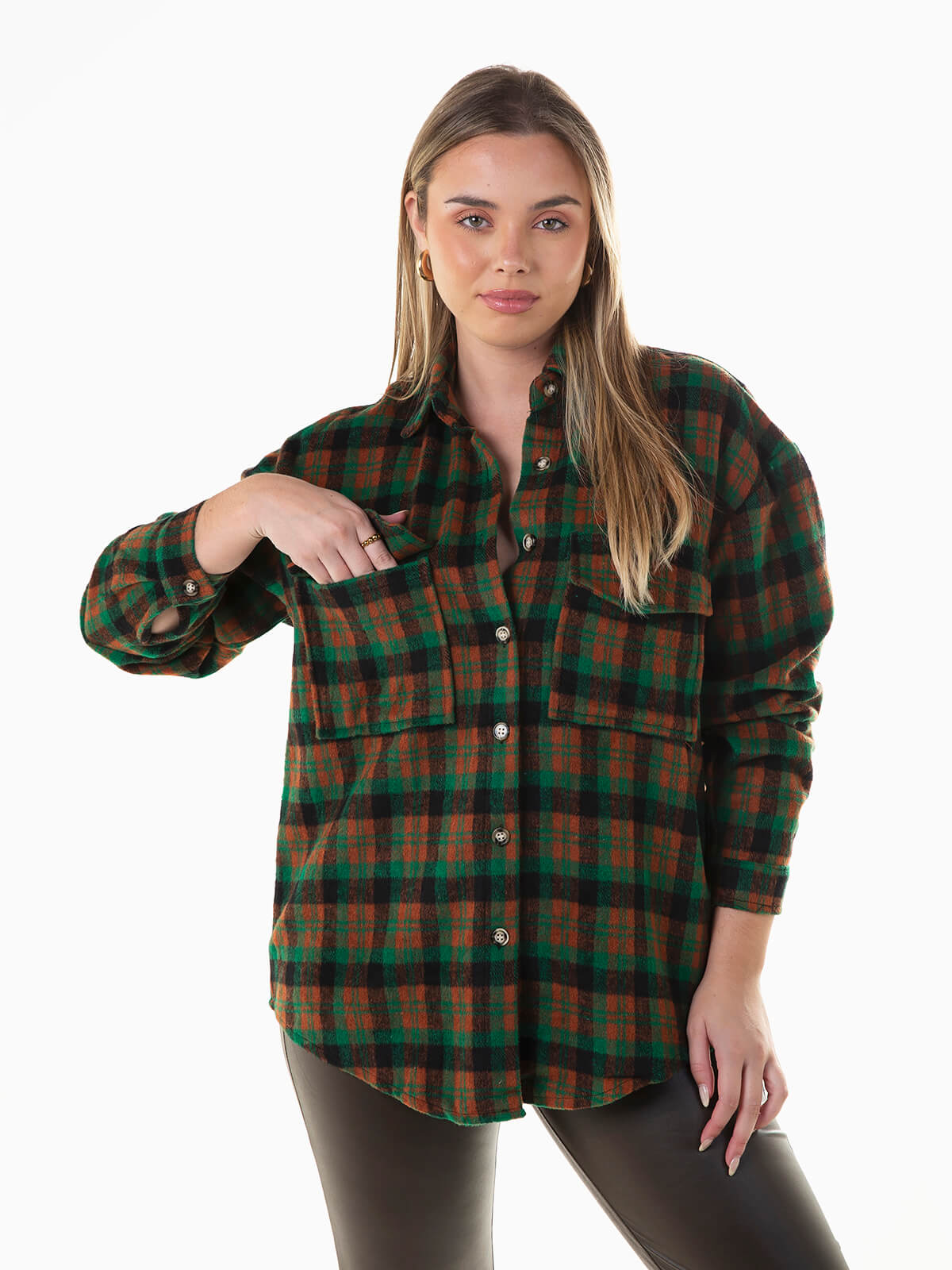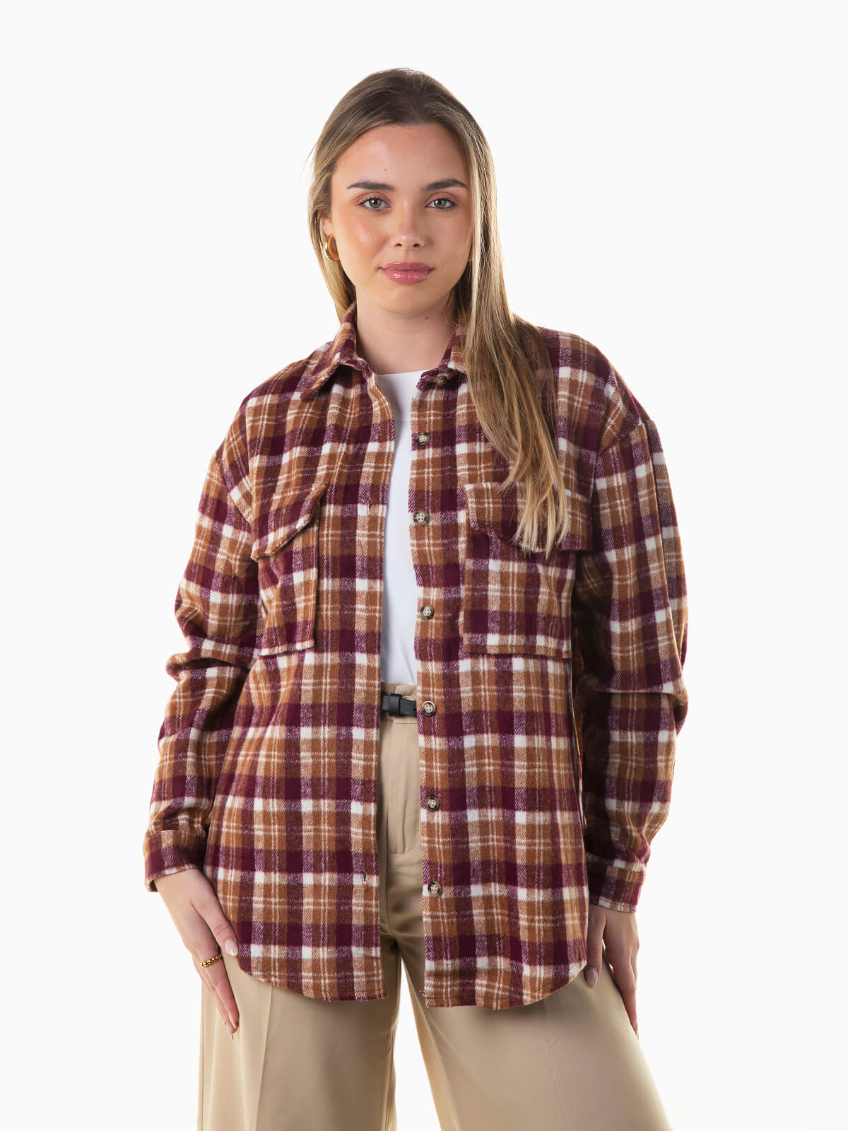 Camisa flanela grossa em xadrez para senhora. Sobrecamisa manga comprida com punhos abotoados e gola abas. 2 bolsos quadrados no peito. Cós arredondado.