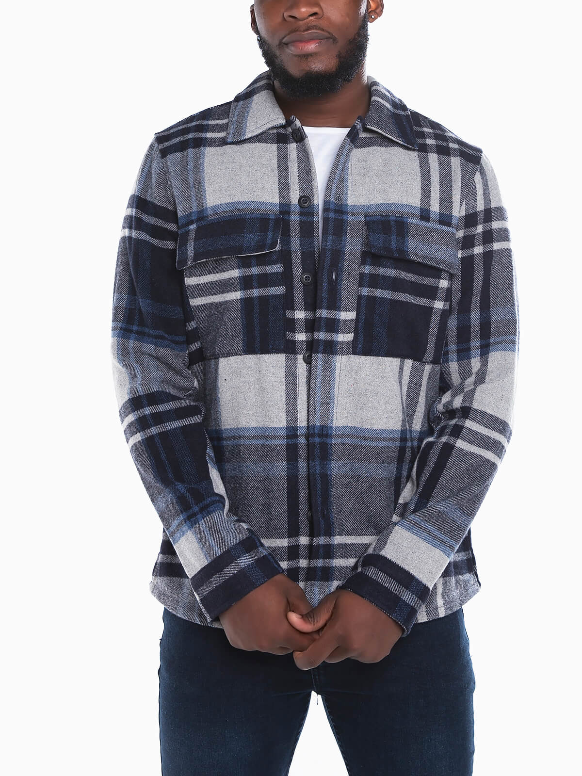 Camisa de flanela em xadrez azul marinho para homem. Camisa manga comprida com punhos abotoados. Bolsos no peito com pala e botão de pressão. Gola de abas. Aperto frontal de botões.