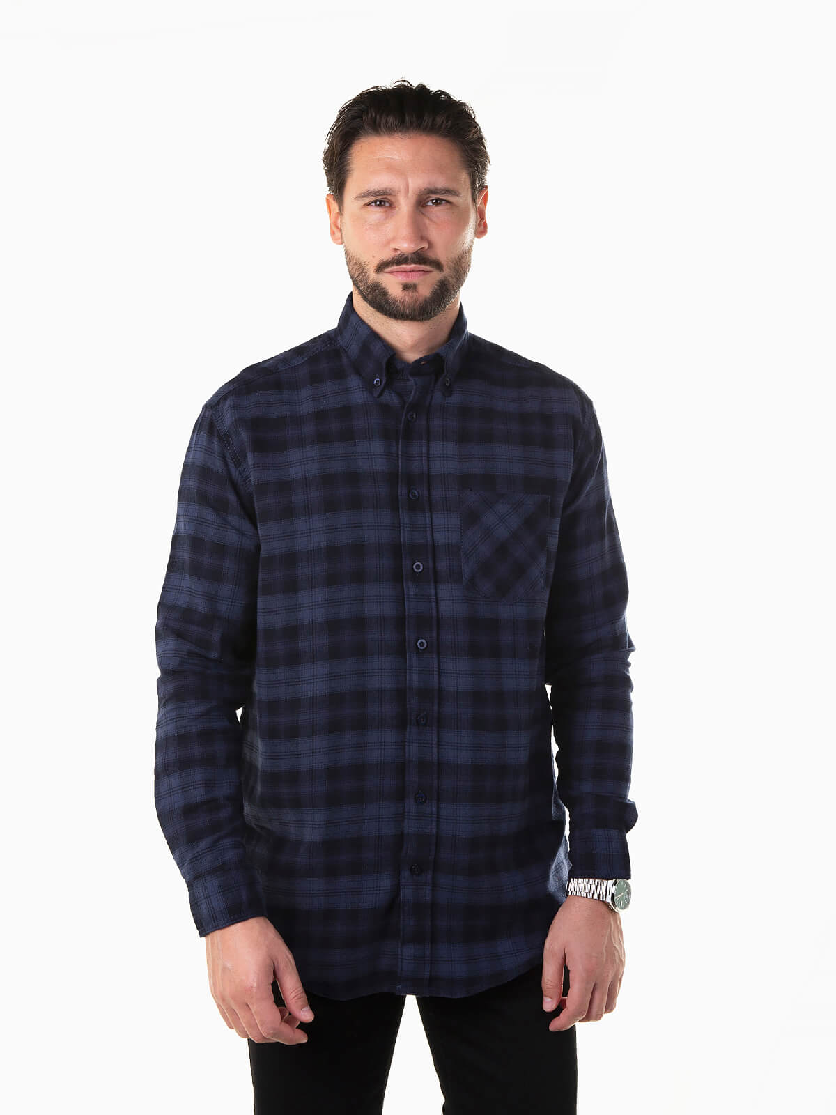 Camisa de homem em flanela macia com padrão xadrez e bolso no peito. Manga comprida com ajuste clássico nos punhos, perfeita para looks casuais ou sobreposição em dias mais frios.