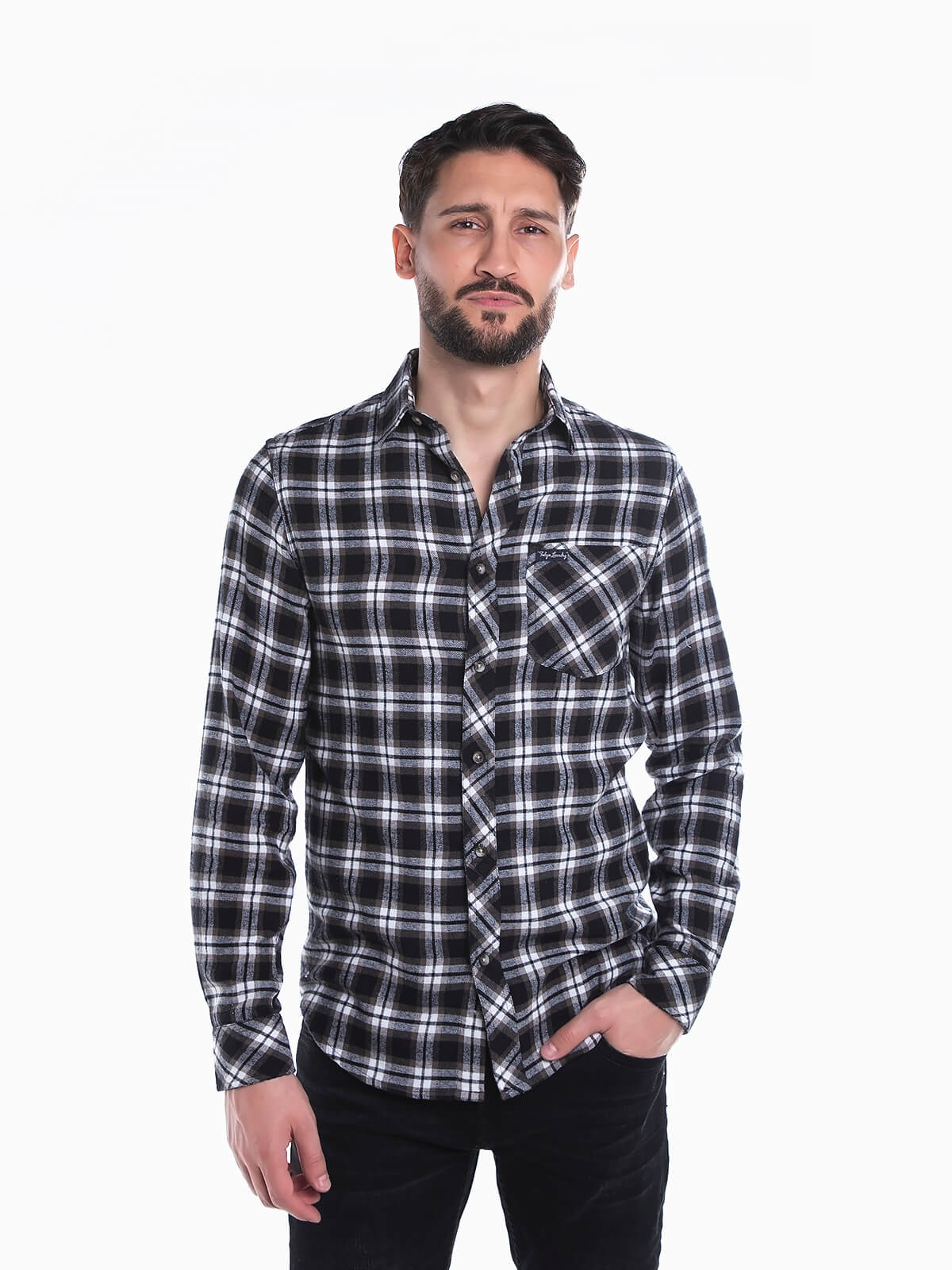 Camisa em flanela xadrez tartan com bolso aplicado no peito. Camisa para homem em tecido 100% algodão de manga comprida com punhos abotoados. Gola de abas. Aperto frontal de botões.