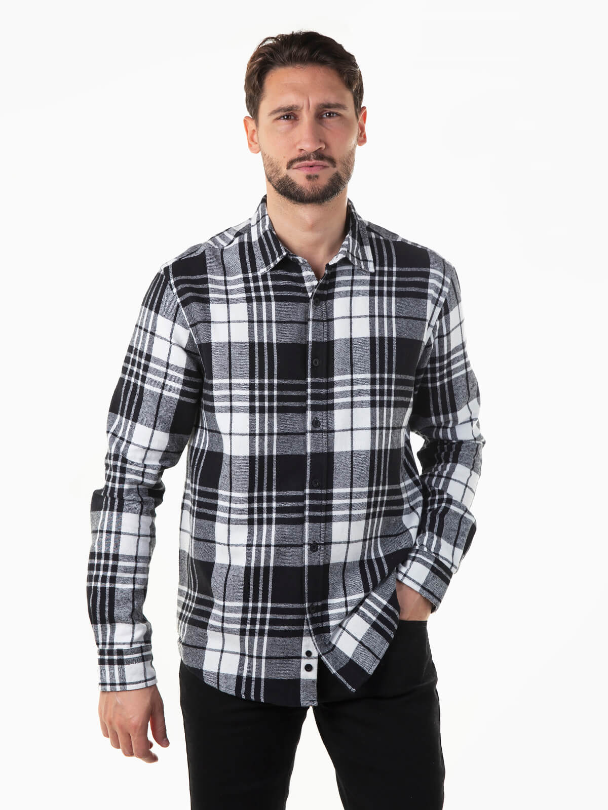 Camisa preta em flanela 100% algodão, agradável ao toque e com maior conforto térmico para homem. Camisa em xadrez com manga comprida e punhos abotoados. Gola abas.
