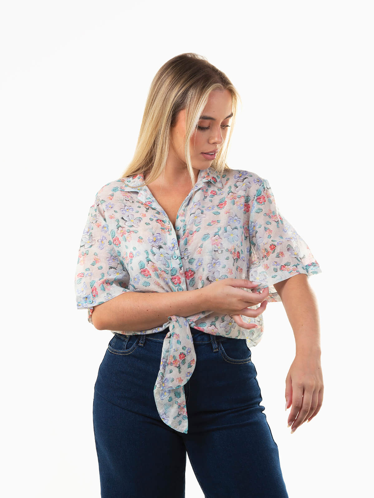 Camisa leve e fluída com estampado floral. Modelo semitransparente de manga curta, com gola abas, botões à frente e detalhe de nó na bainha que acrescenta um toque descontraído ao look. Combina-a com calças fluídas ou uns jeans wide leg para um look casual moderno, ou aposta em sandálias rasas para um visual de verão cheio de frescura.
