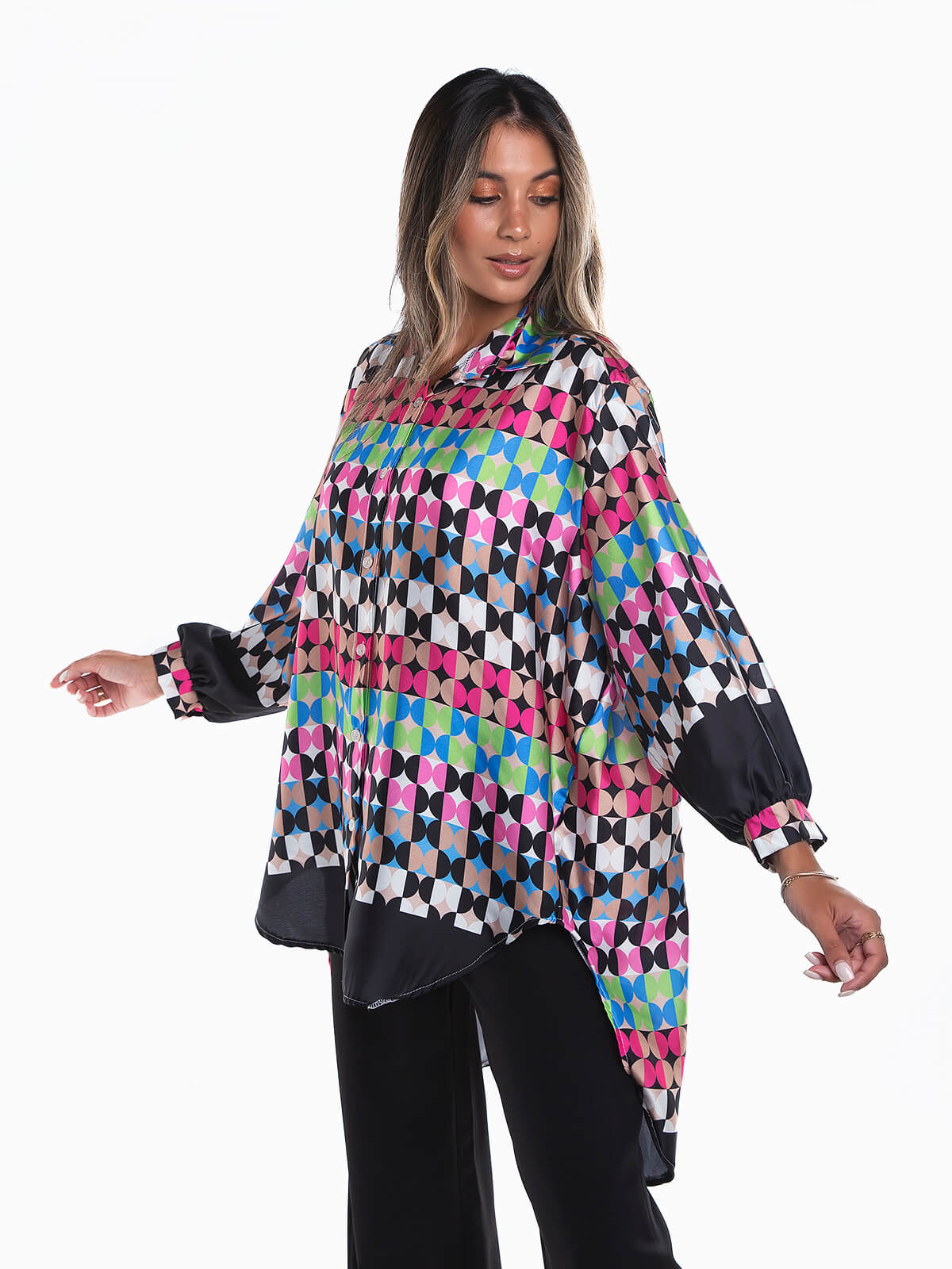 Camisa fluída acetinada com estampado geométrico para senhora. Camisa manga comprida abalonada com punhos abotoados e gola de abas. Cós arredondado mais comprido atrás.