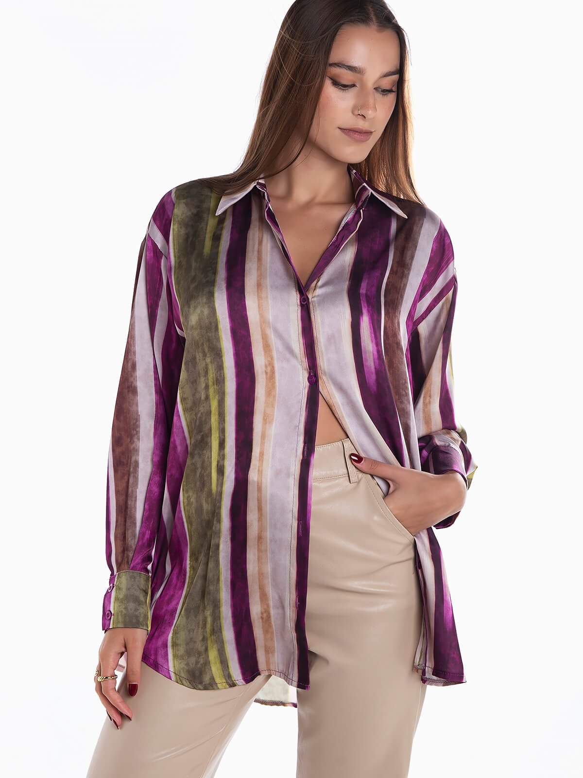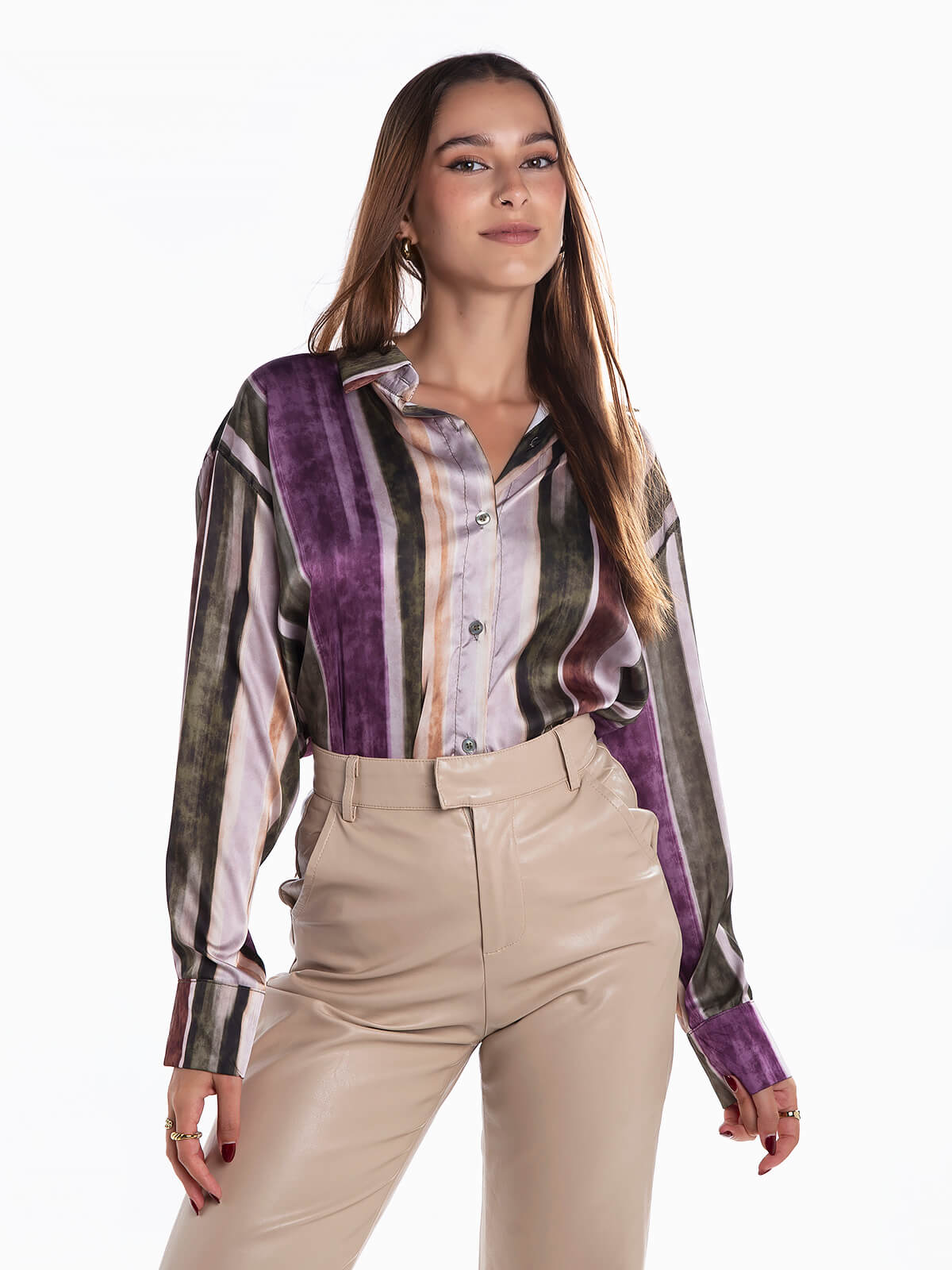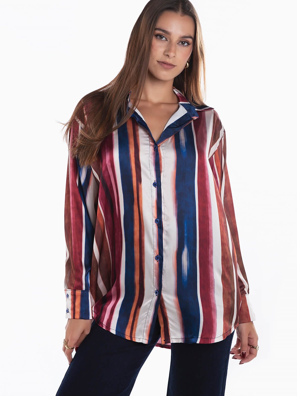 Camisa fluída às riscas em tecido acetinado. Camisa manga comprida com punhos abotoados e gola abas. Aperto frontal de botões.