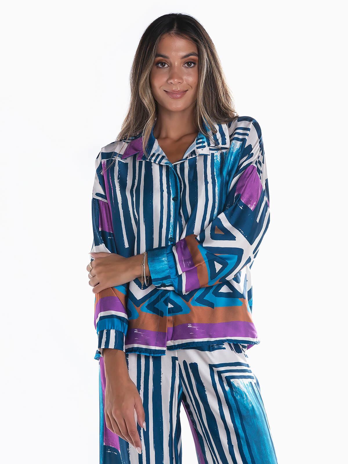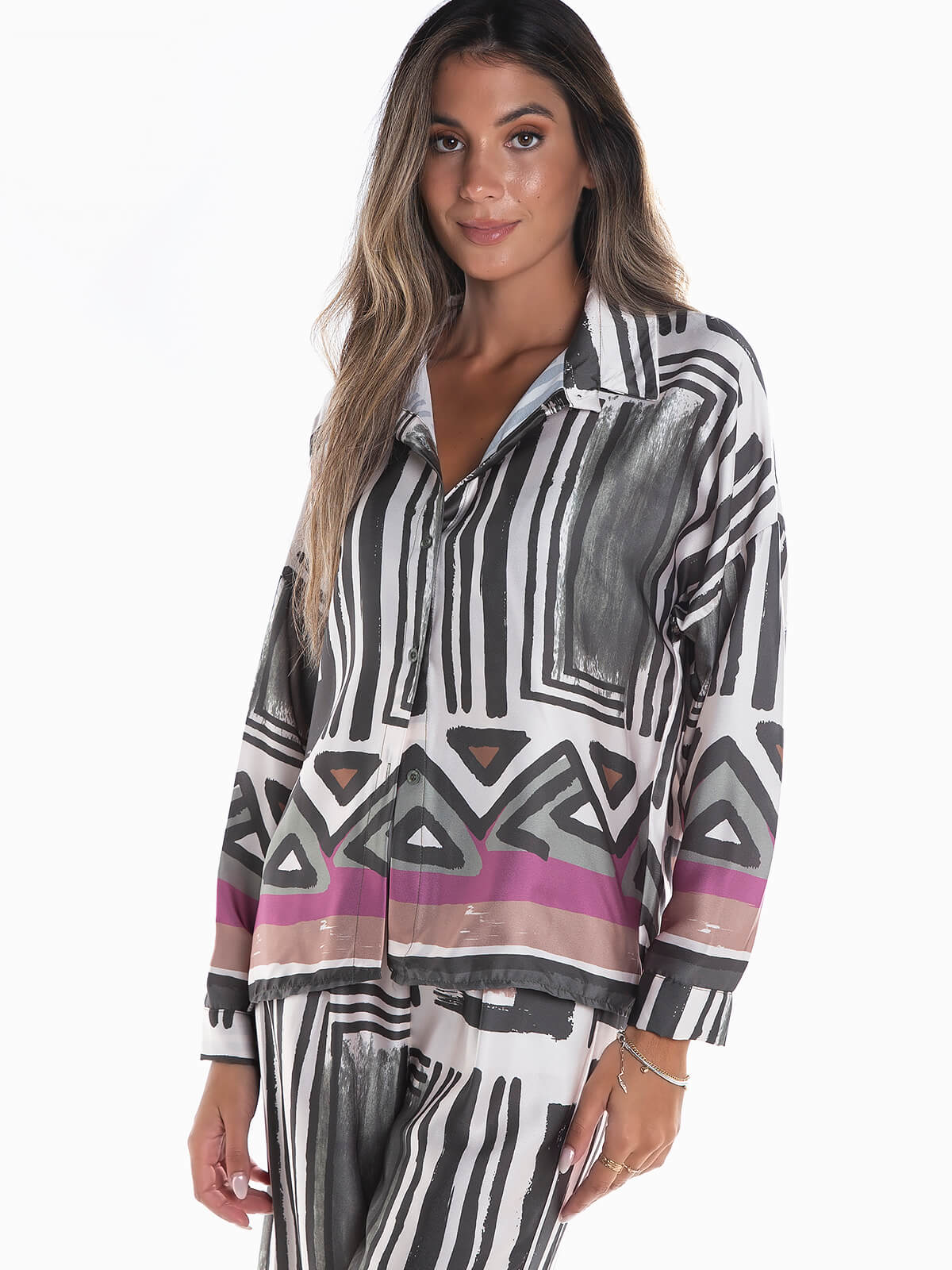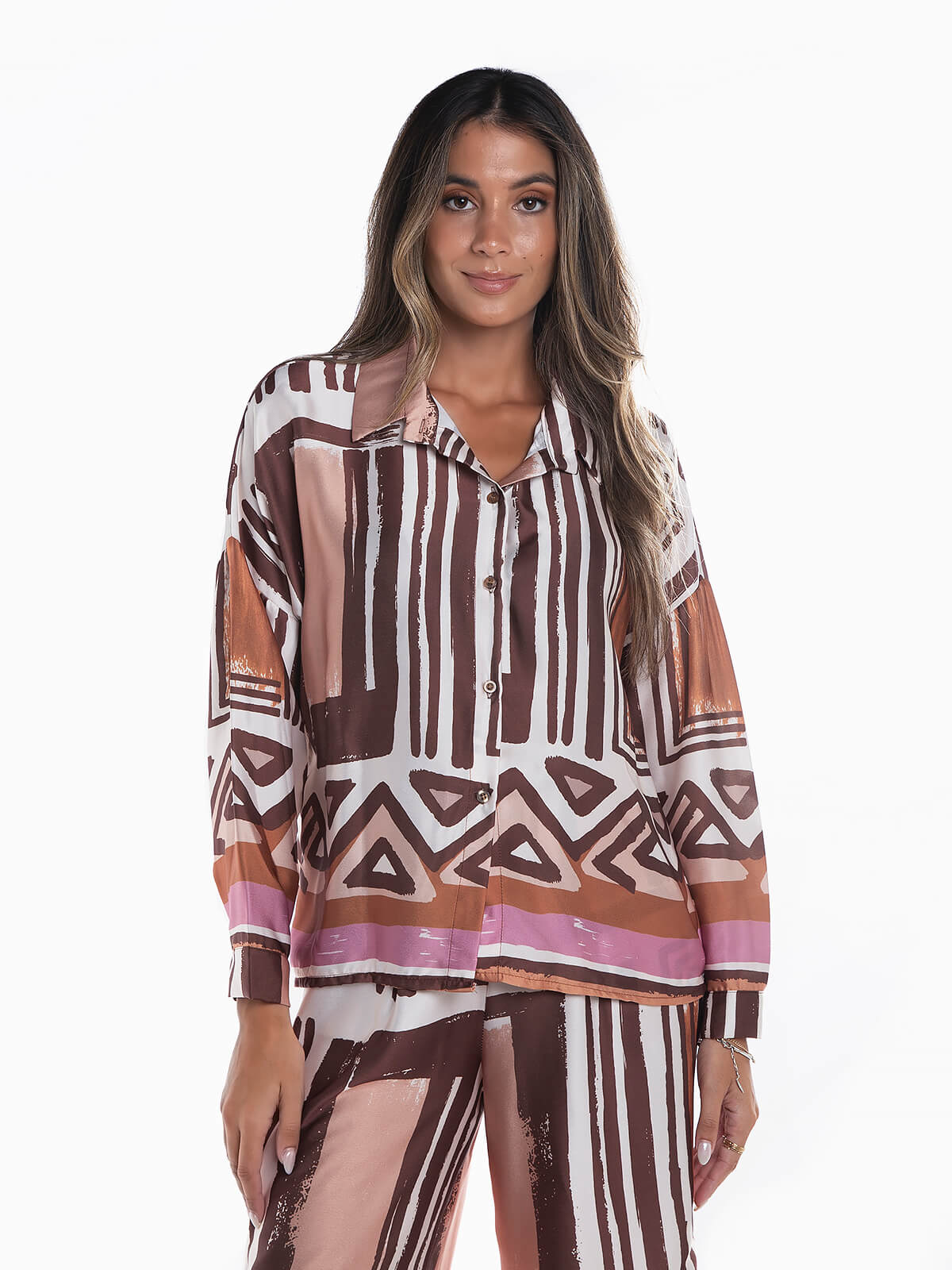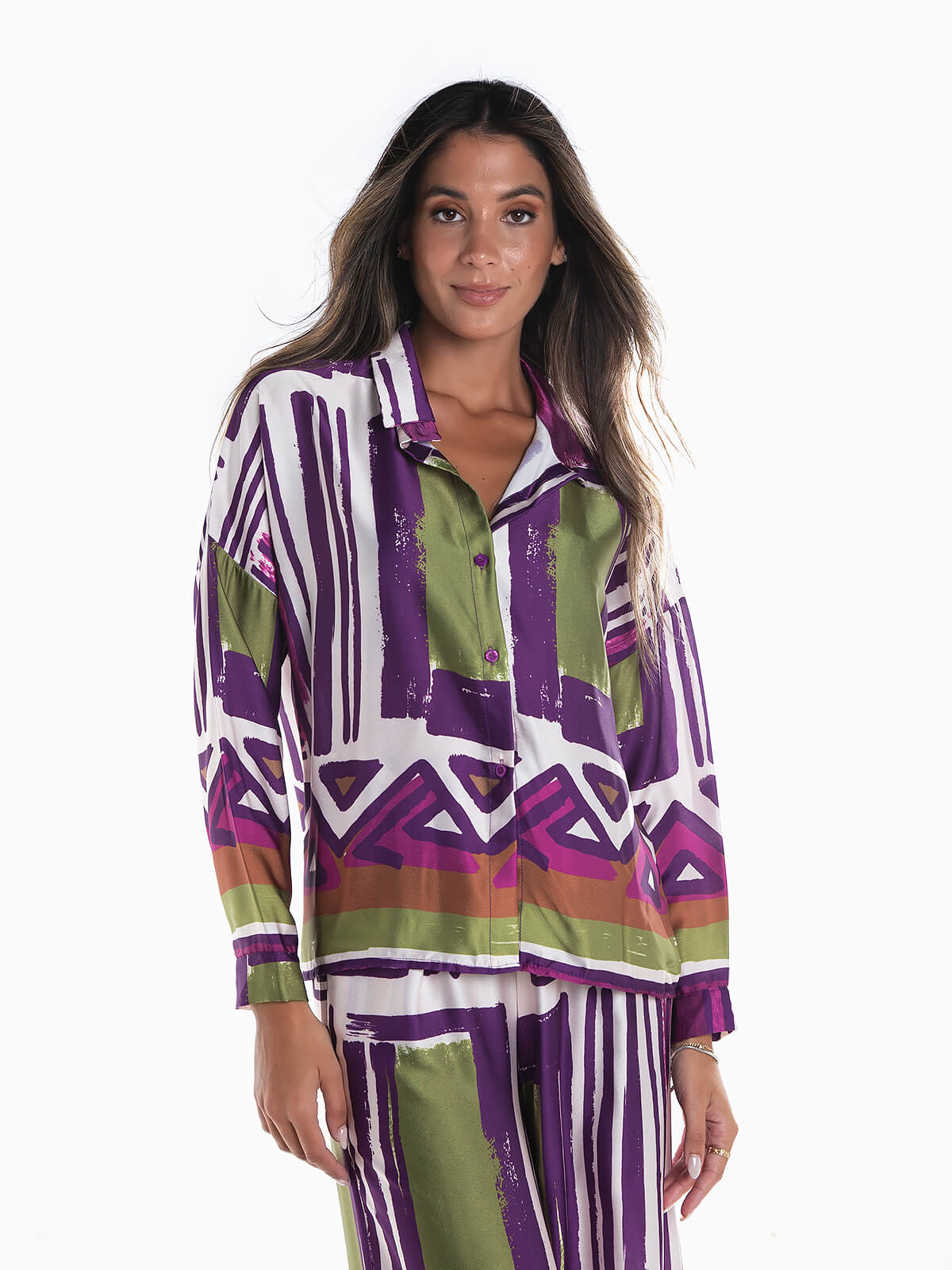Camisa fluída acetinada com estampado abstrato para senhora. Camisa de ombros descaídos com punhos abotoados e gola e abas. Aperto frontal de botões.