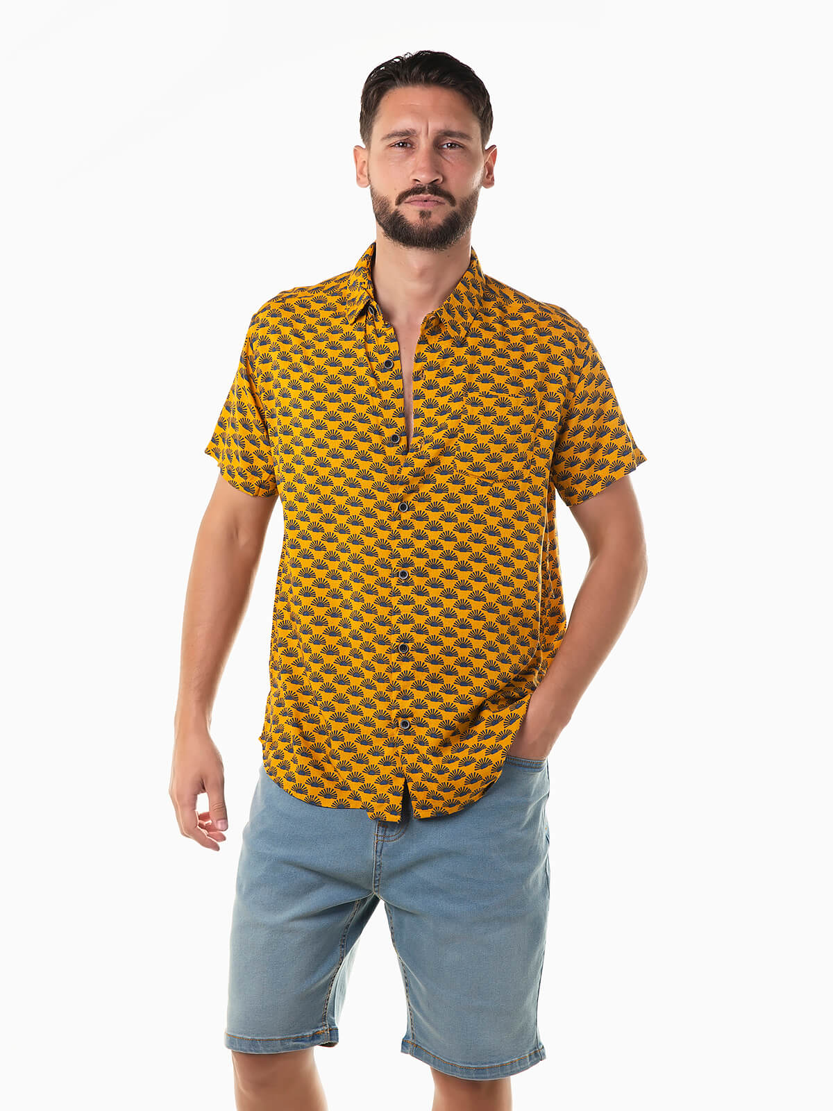 Camisa fluída em amarelo torrado com estampado em contraste. Camisa manga curta para homem com bolso no peito e gola de abas. Aperto frontal de botões.
