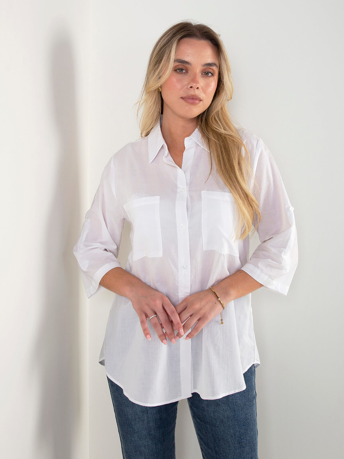 Camisa fluída de manga comprida com presilhas para ajuste. Modelo leve e confortável, com bolsos frontais e fecho de botões. Ideal para looks versáteis e descontraídos.